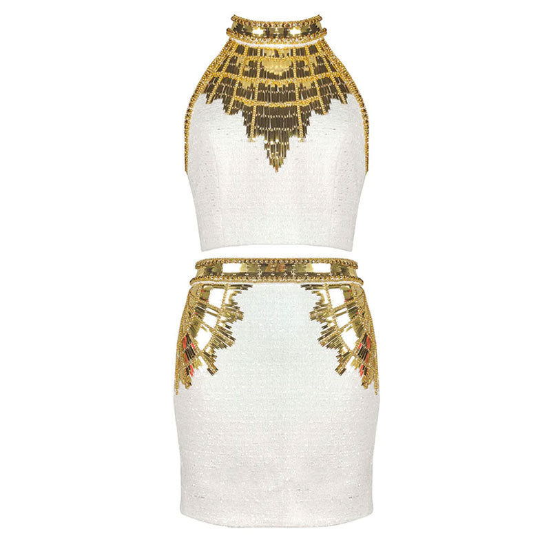 Exquisite Golden Tone Sequin Beaded Halter Neck Cropped Tweed Top