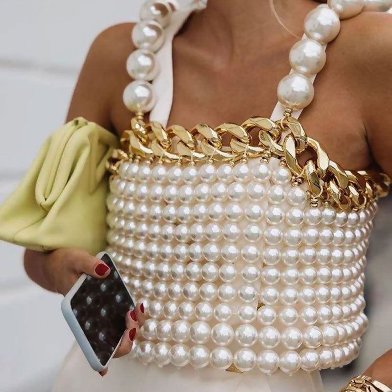 Luxury Metal Chain Oversized Imitation Pearl Beaded Backless Crop Top - White