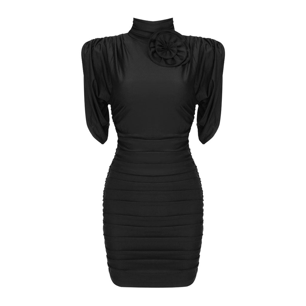Unveil elegant femininity with our designer dress. Crafted with comfortable black fabric. this figure-hugging little black dress features a high neckline that's detailed with a delicate rose ornament for an extra touch of elegance. The all-over ruched design is highlighted with the draped petal sleeves and it has a concealed zip fastening to the back for easy on. Perfect for any special occasions. this exquisite piece will make you look amazed. Try to style it with rhinestone stilettos and a shoulder bag to embrace the feminine energy.