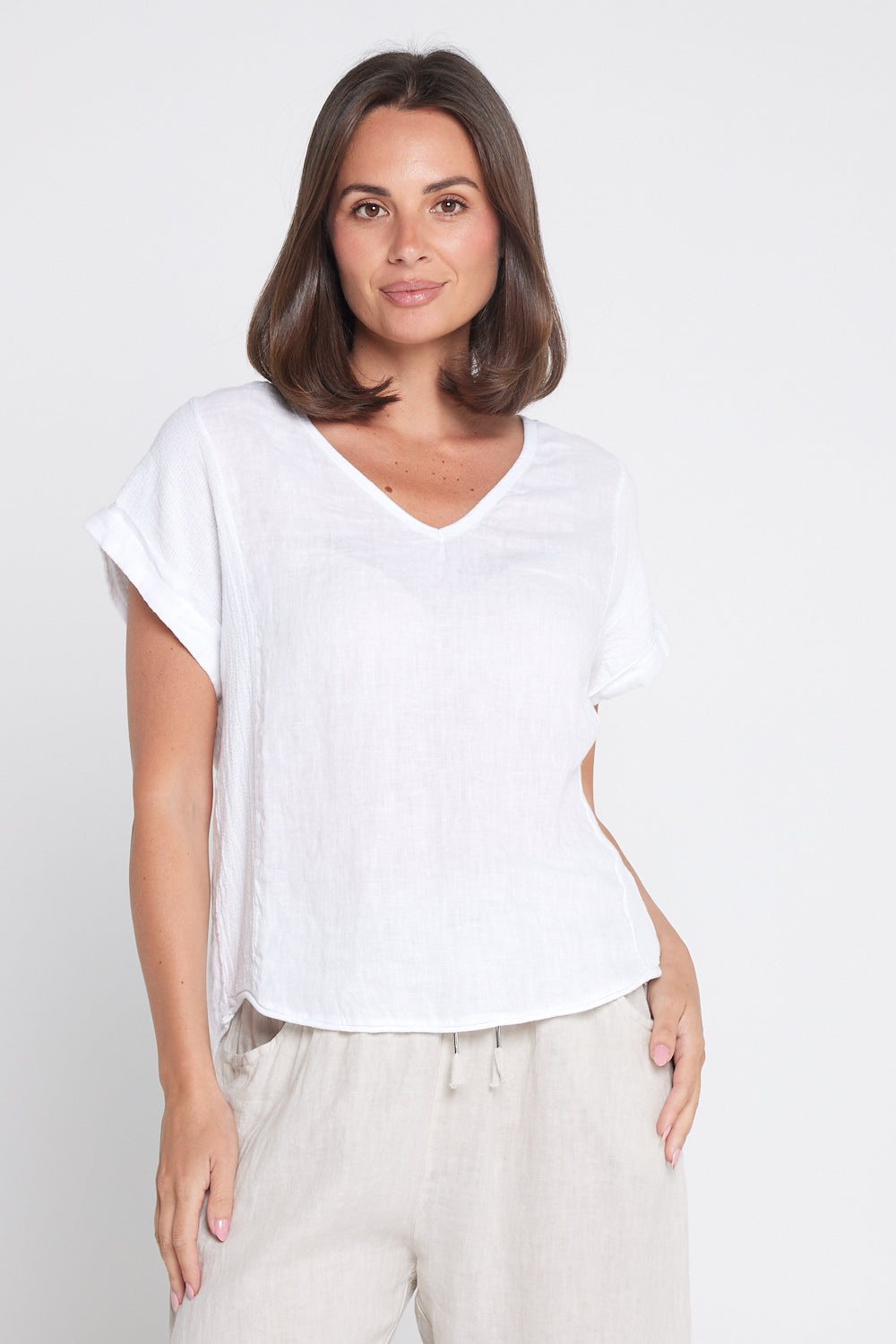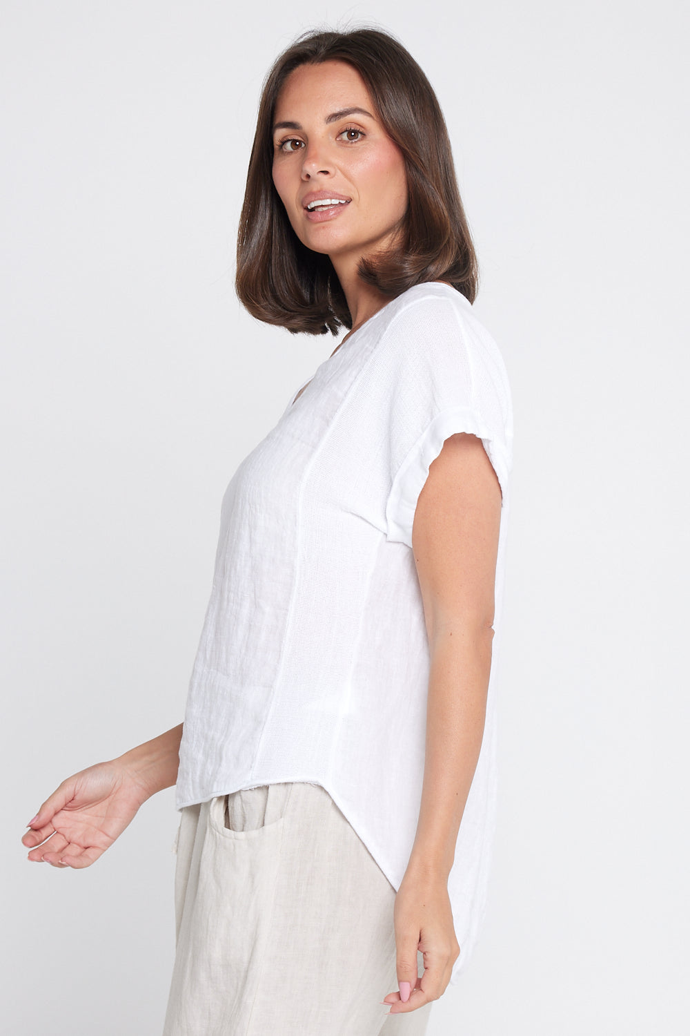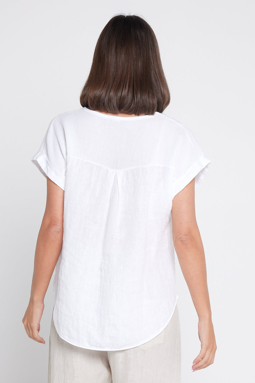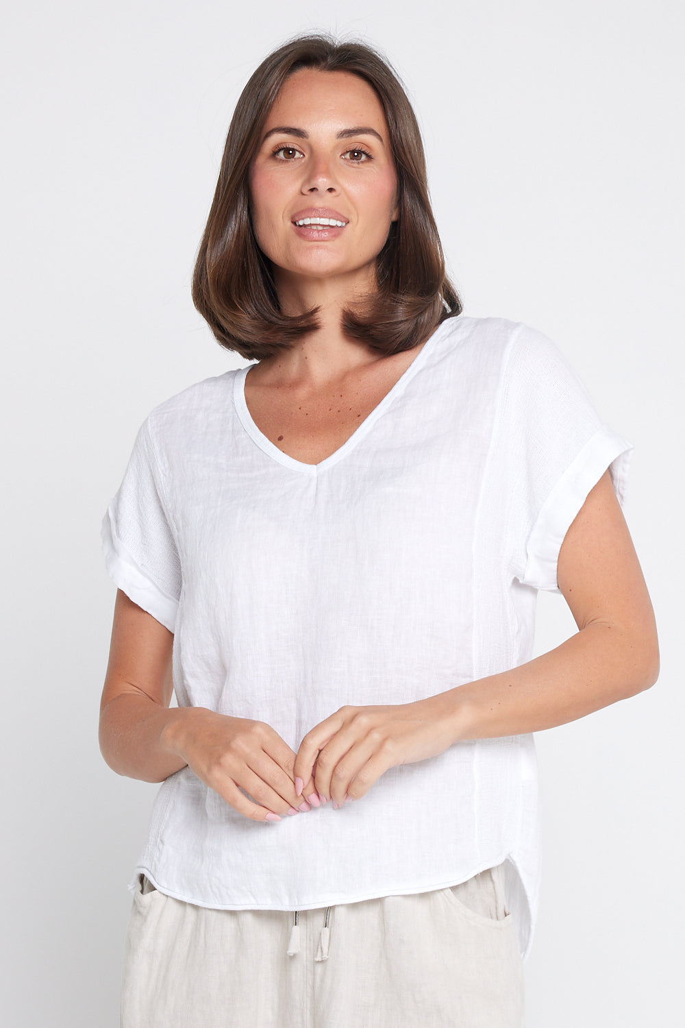 Introducing the Raquel Linen Top by La Strada, now available in crisp white. This lightweight and breathable top features a flattering V-neckline and short sleeves with rolled cuffs for a relaxed look. The body of the top is designed with a comfortable, loose fit and a curved hemline, making it a versatile piece for any wardrobe. Crafted from a blend of linen and cotton, it offers a soft touch and durability. Made in Italy, this top combines style and comfort effortlessly.