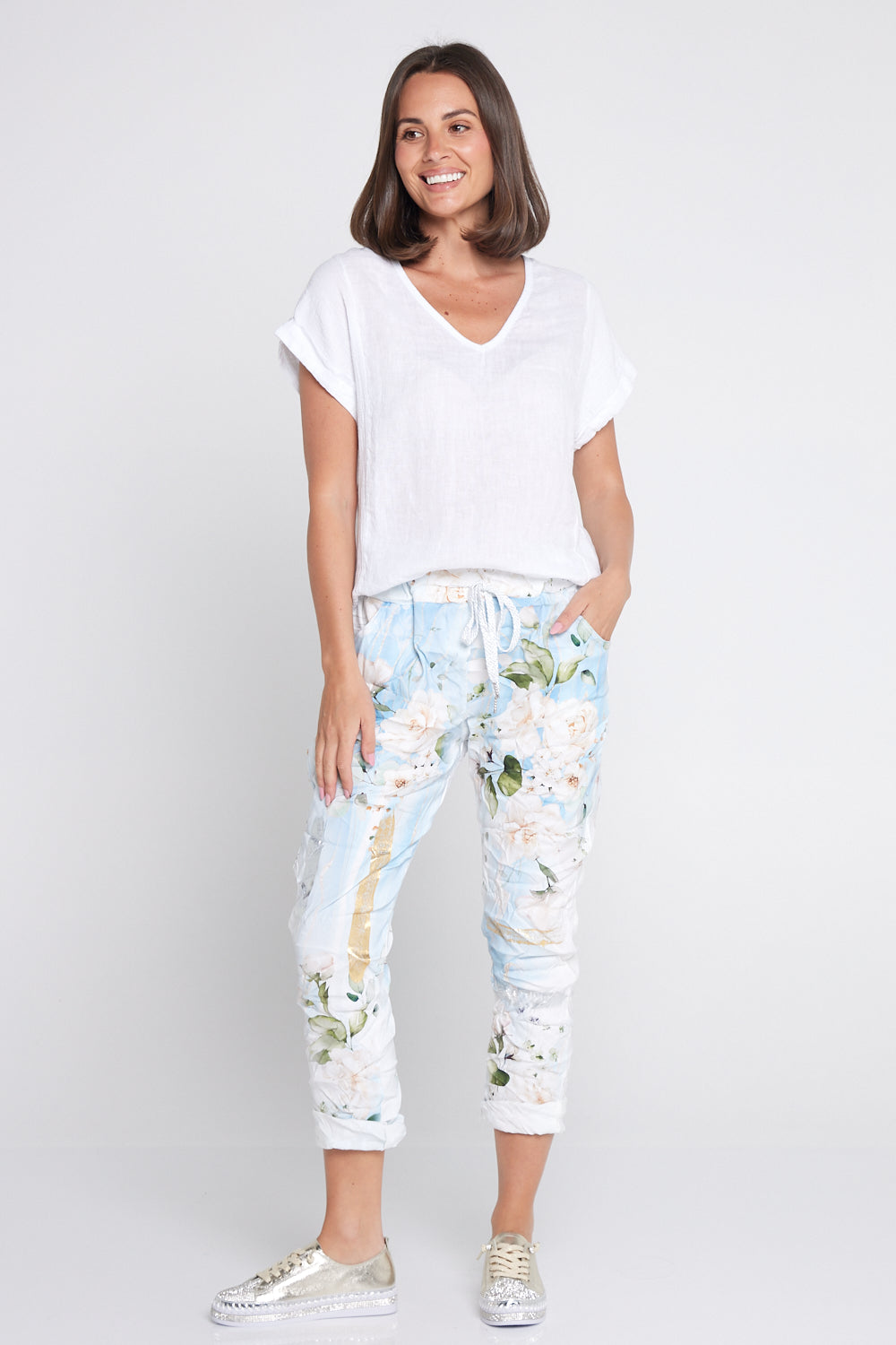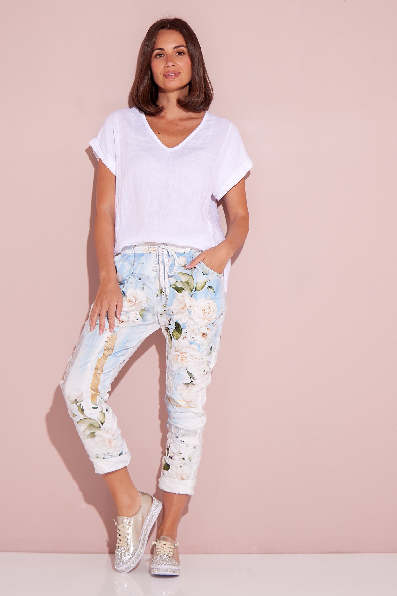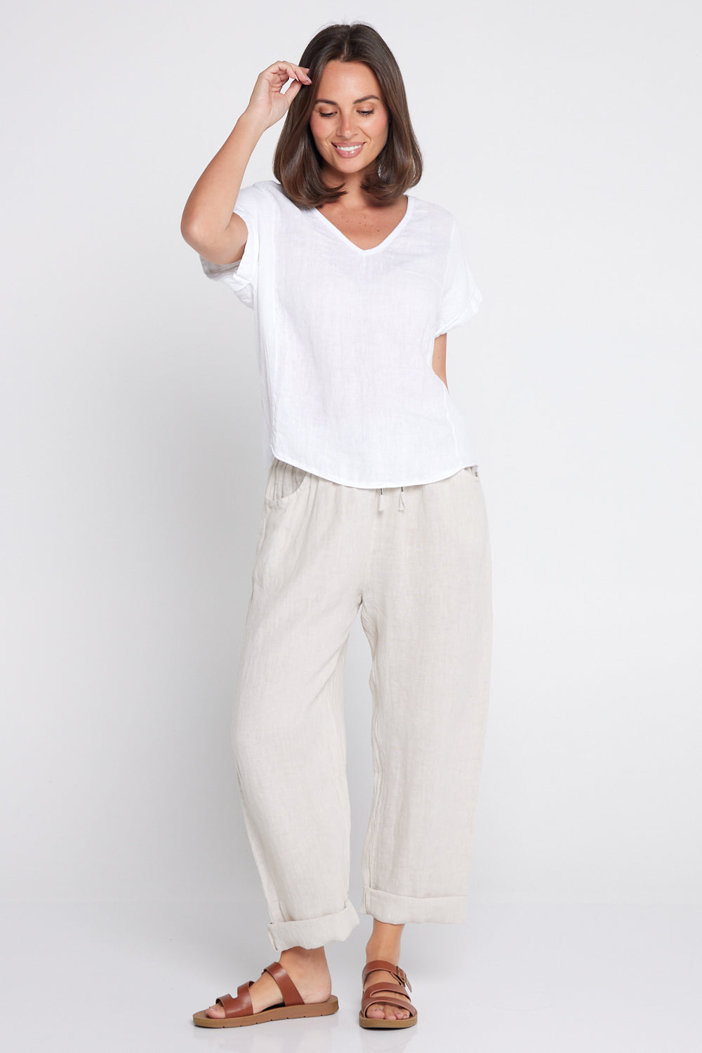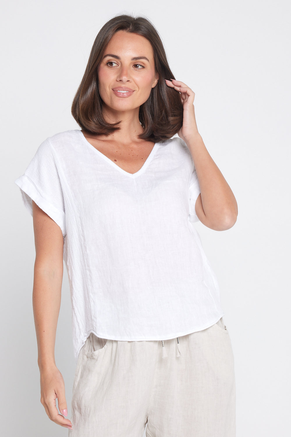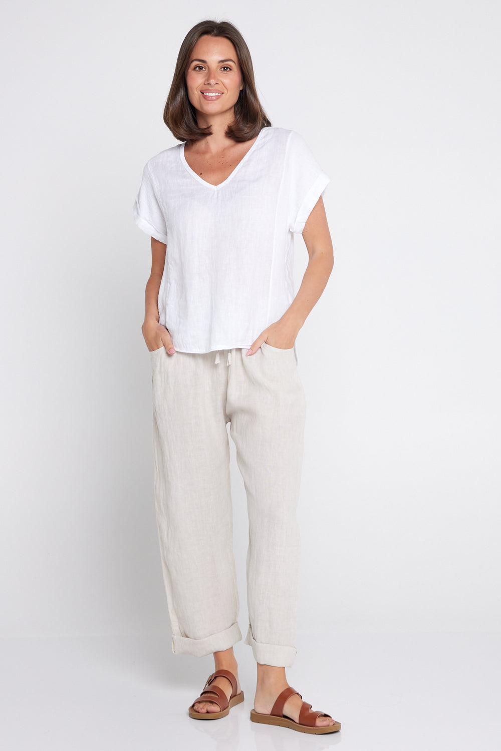 Introducing the Raquel Linen Top by La Strada, now available in crisp white. This lightweight and breathable top features a flattering V-neckline and short sleeves with rolled cuffs for a relaxed look. The body of the top is designed with a comfortable, loose fit and a curved hemline, making it a versatile piece for any wardrobe. Crafted from a blend of linen and cotton, it offers a soft touch and durability. Made in Italy, this top combines style and comfort effortlessly.