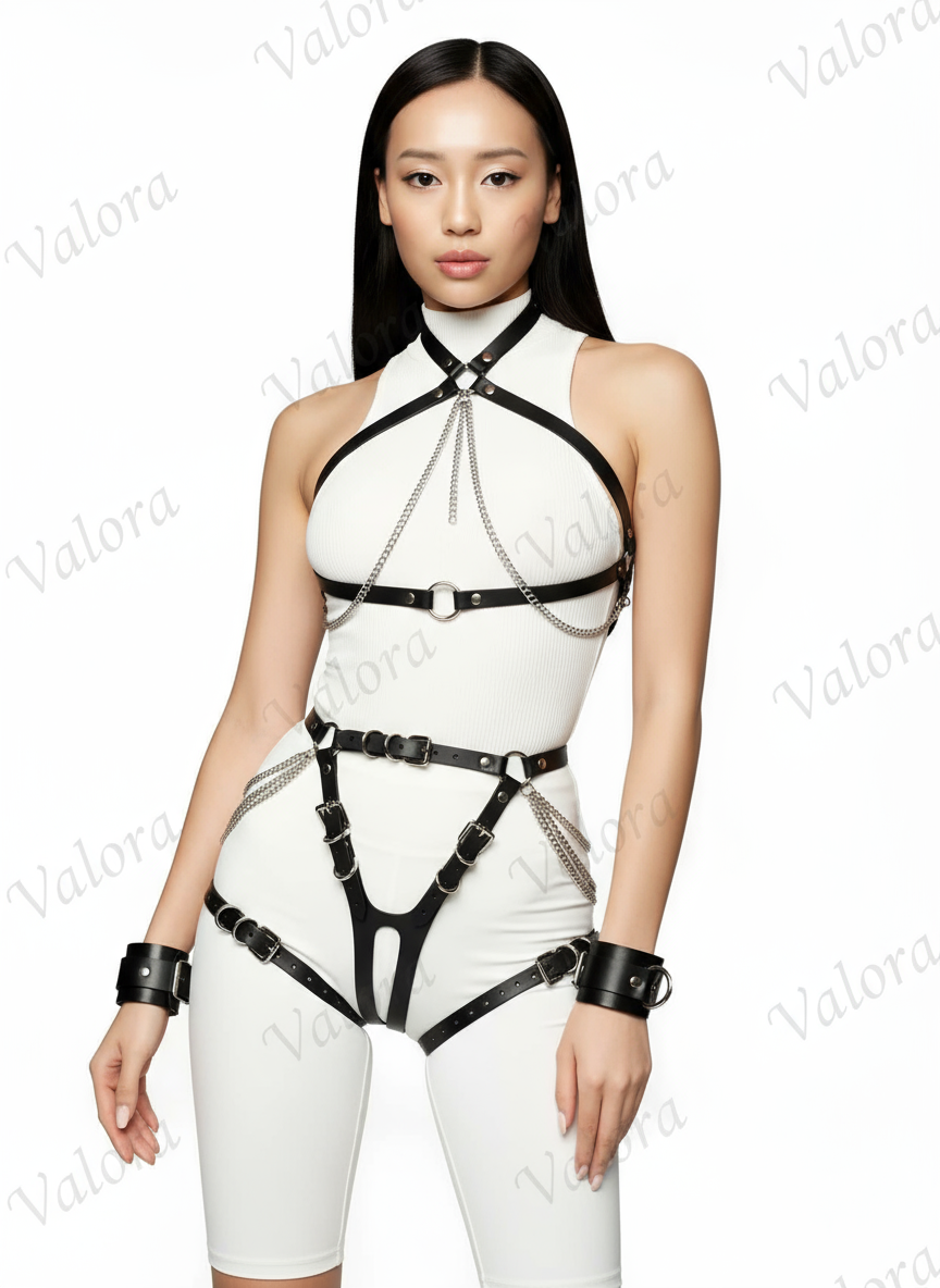 Ignite your most daring side with this black leather harness set adorned with elegant chain detailing. Designed to contour your body with precision, it adds a bold yet refined edge to your look. The soft yet sturdy leather straps offer full adjustability, while the polished metal chains bring a hint of rebellious glamour. Perfect for creating a captivating silhouette that demands attention.