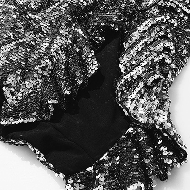 Sparkly Tie Neck High Neck Half Button Ruffle Split Side Longline Sequin Blouse