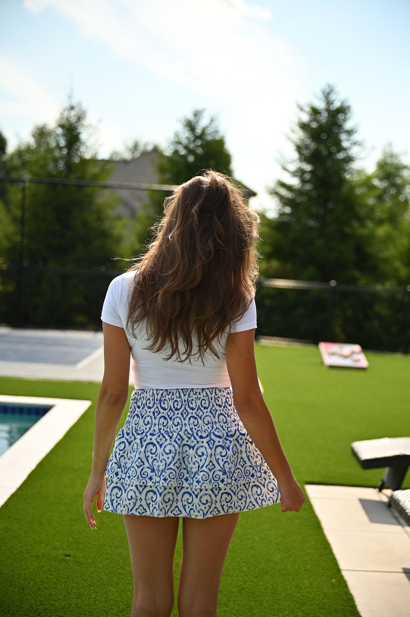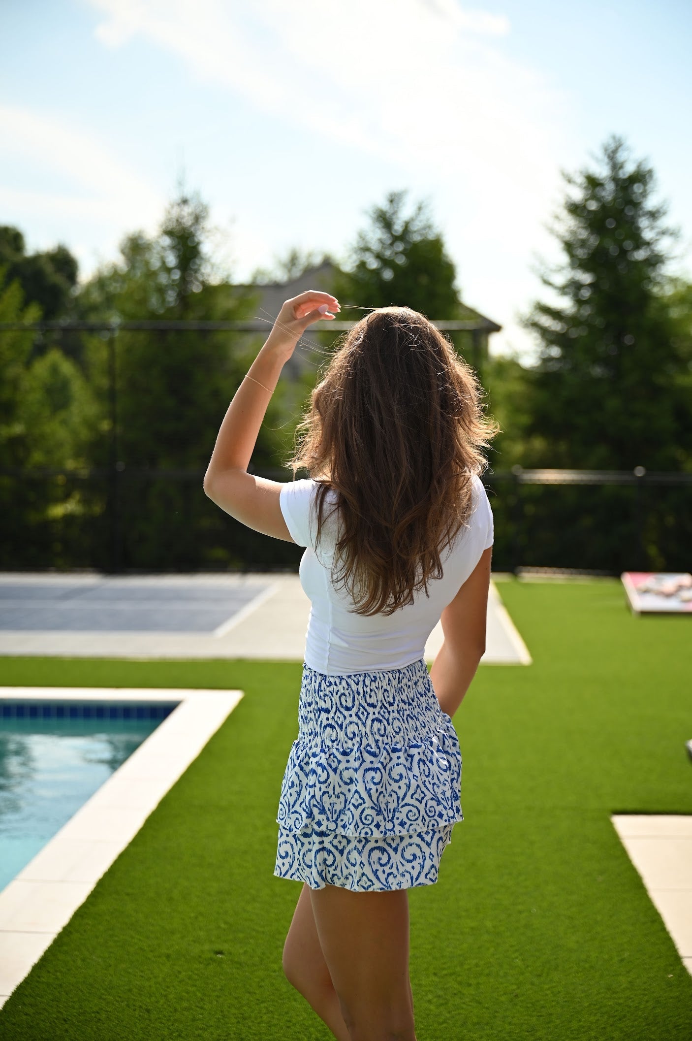 Add a pop of color to your wardrobe with this blue and white tiered mini skirt. Featuring a comfortable smocked waistband and playful ruffle layers, it’s perfect for any casual outing. Pair it with a simple top and sandals for a chic, effortless look. Available in various prints and sizes.