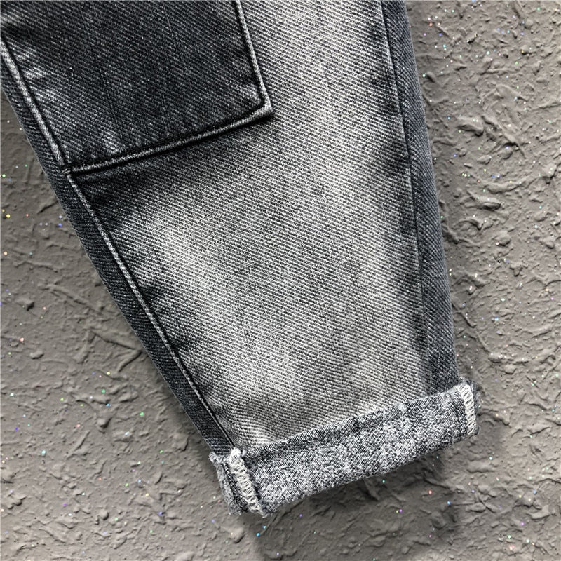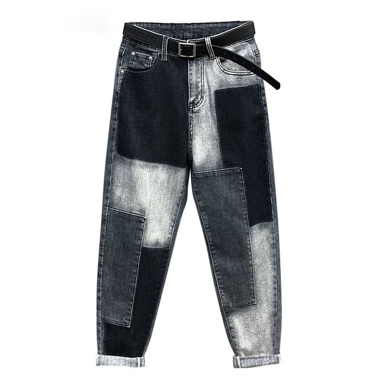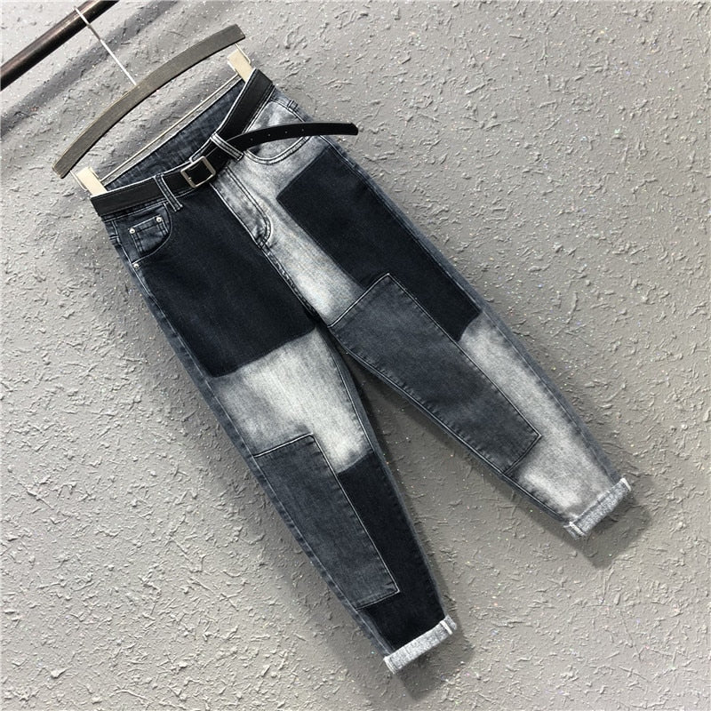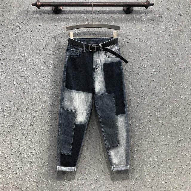 Patchwork Pattern High-Waist Jeans with Zipper Fly Closure and Cotton Material