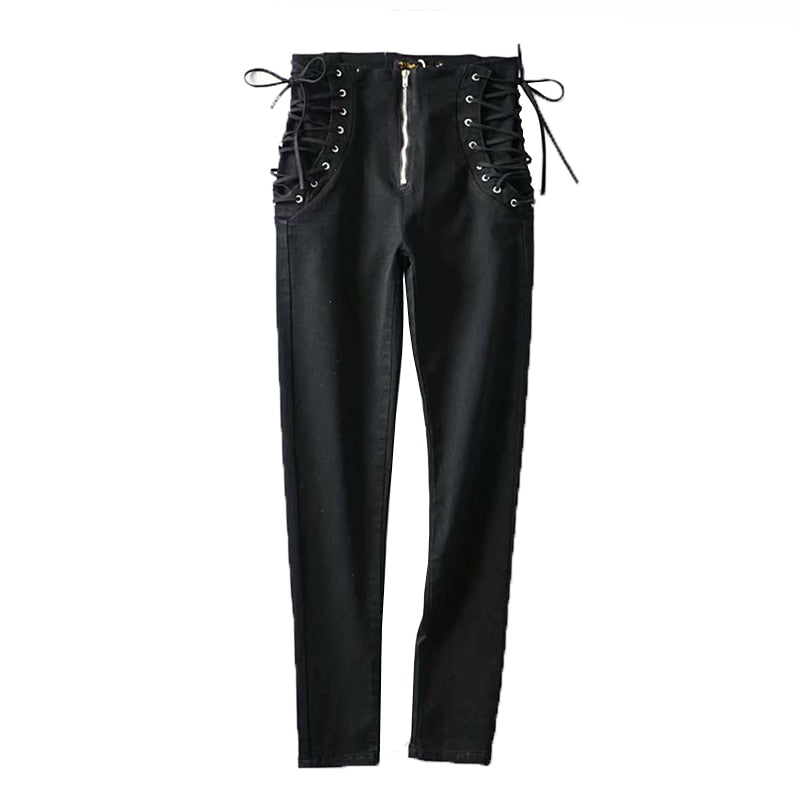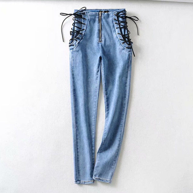 High Waist Skinny Fit Jeans with String Decoration, Zipper Fly Closure, and Cotton Polyester Material