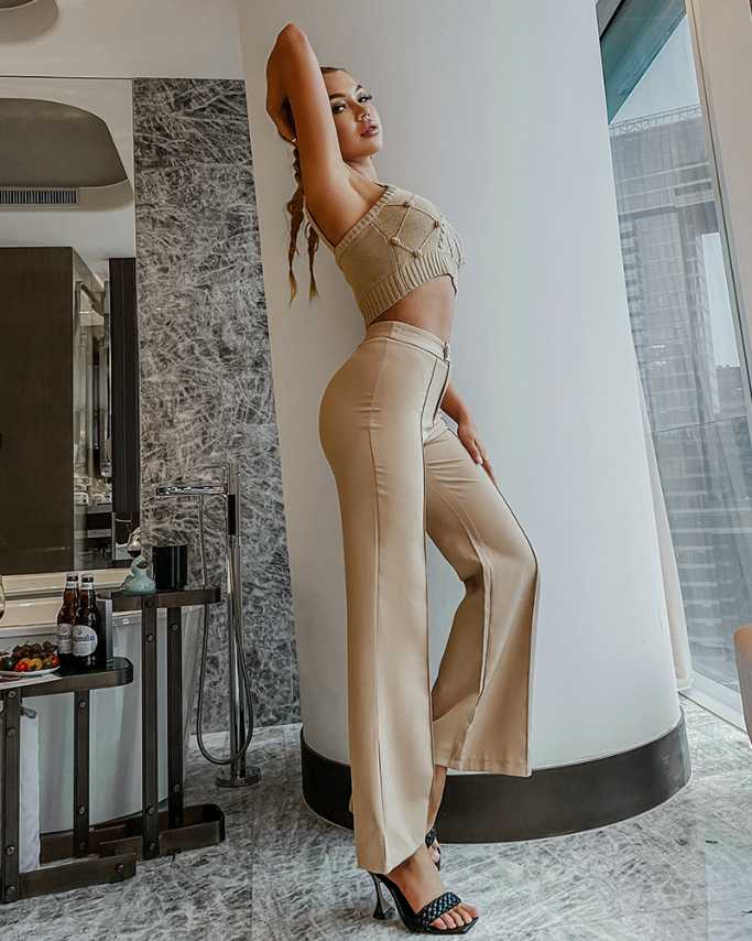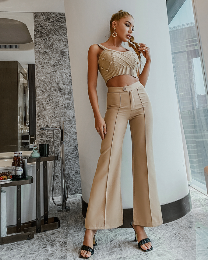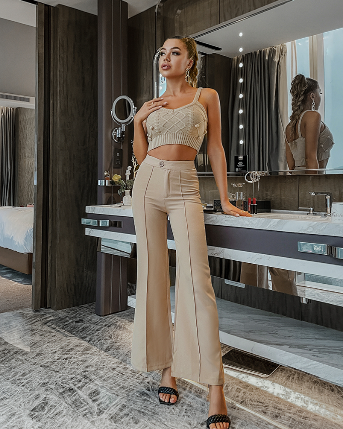 Sleeveless Crop Top and Flaring Pants Set Made From Polyester Material with Stitching Pattern