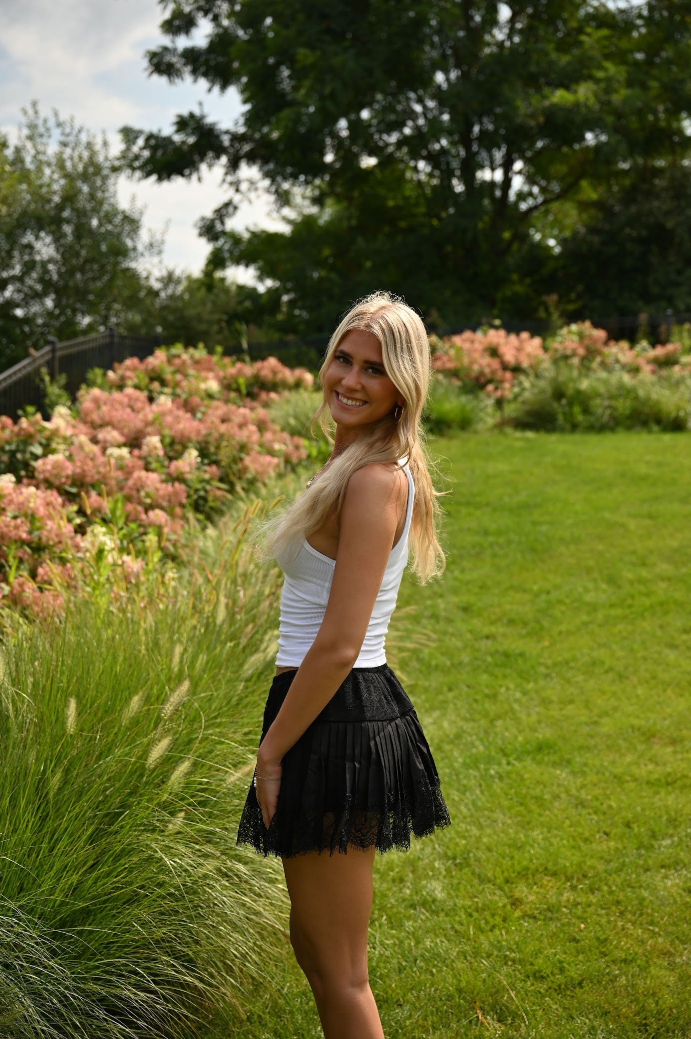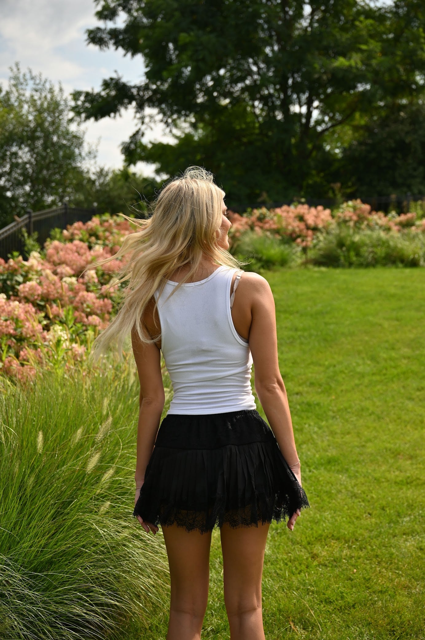 Score major style points with the Ritz Skirt! This white lace mini skirt features built-in shorts for added comfort and convenience. Whether you're hitting the dance floor or strolling through town, this skirt will keep you looking chic and feeling carefree. (Who said you can't have it all?!)