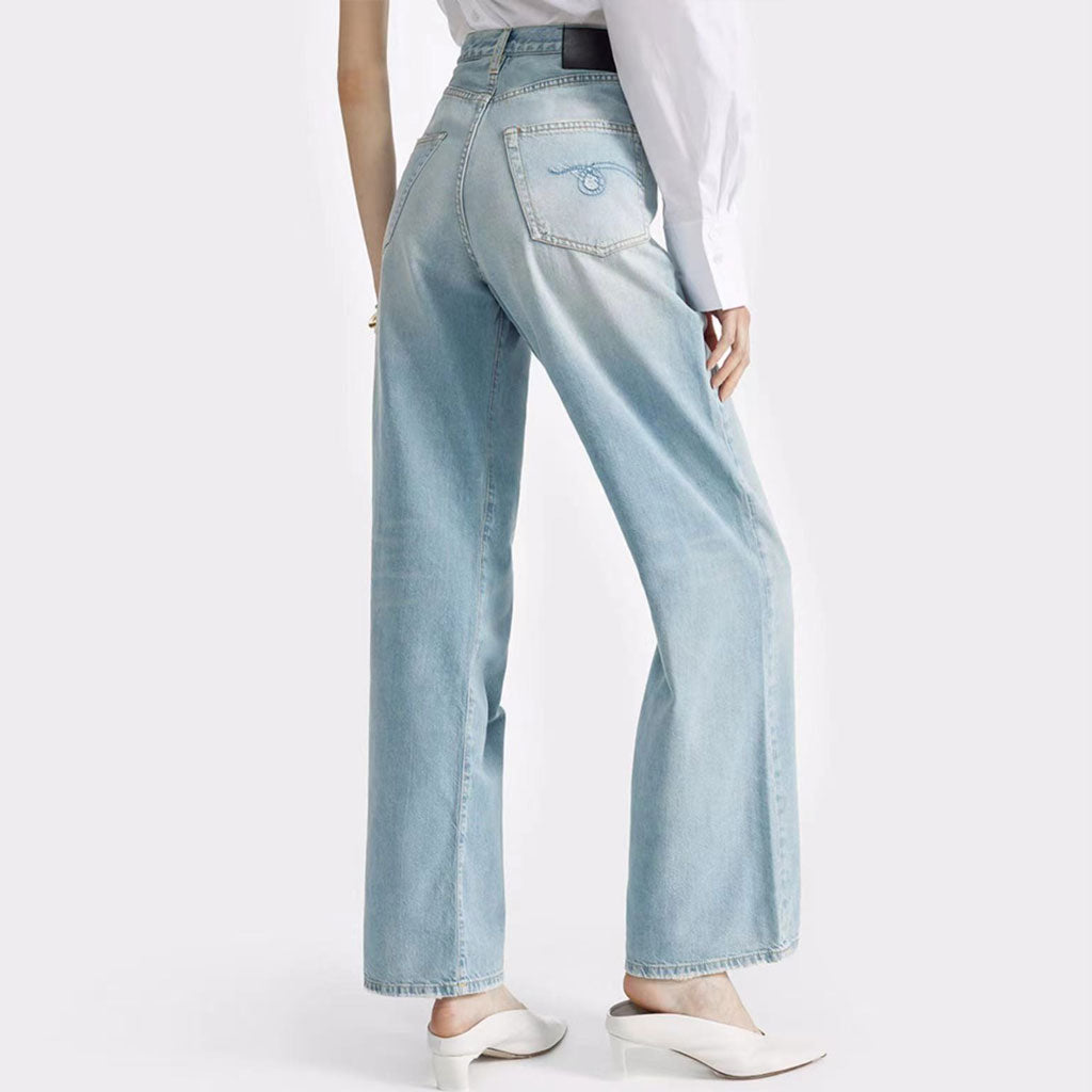 Nail the art of effortlessly chic style with this worn look pair. The staple-worthy jean sits high on the waist with pleated detailing below and features a relaxed wide leg finishing with a little flare at the full-length hem. It's much more summer-friendly than your average denim for it lets some air in. We love it with the specific faded blue wash and whiskering which bring some worn feels. Pockets. zip fly with button closure and belt loops. they'll satisfy you of whatever you're dreaming of with the basic and versatile jeans. The it-girl baggy jean is a must for everyday look as it can be dressed up with shirting. heeled sandals and a baguette bag or down with a crop tank and sneakers.