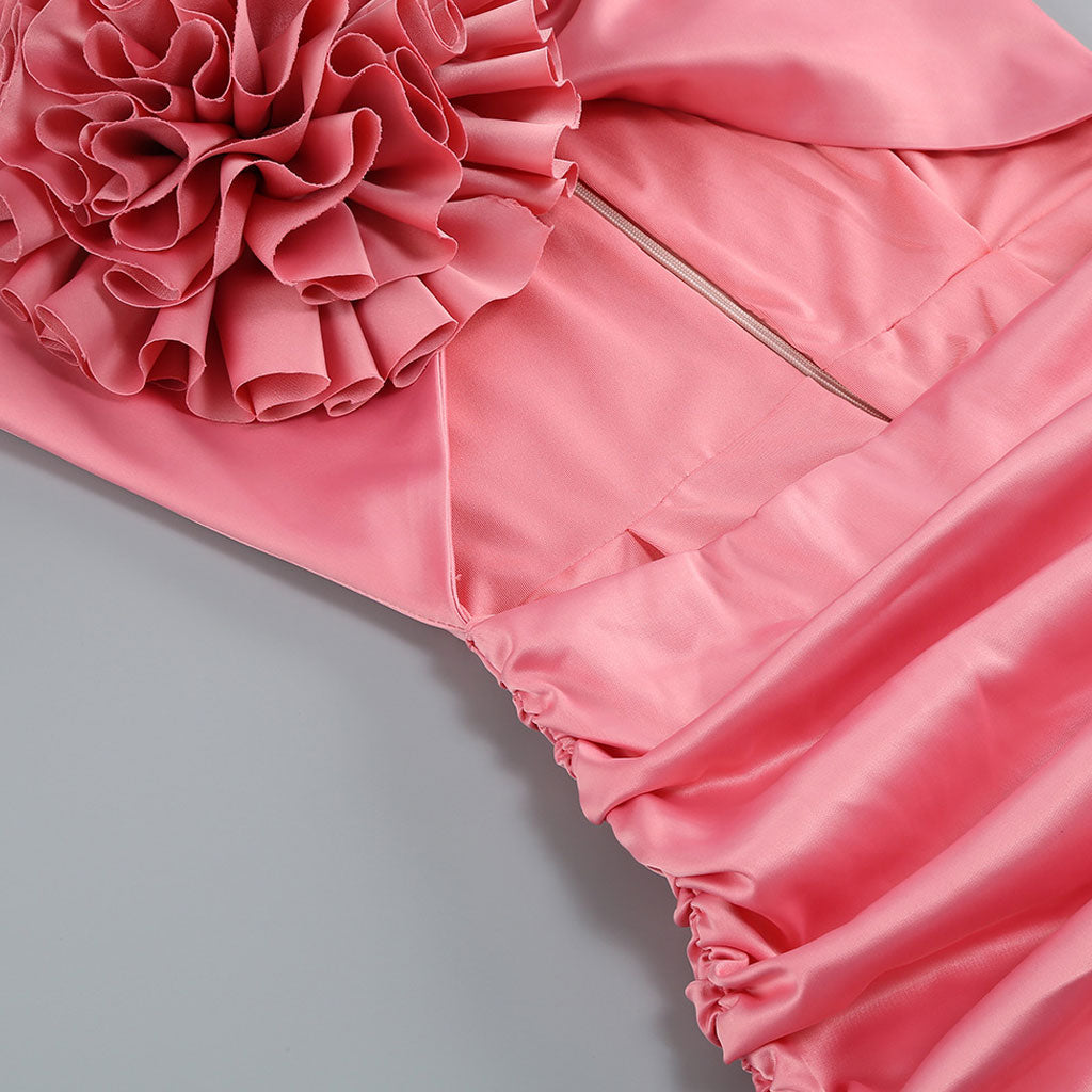 Asymmetrical Rosette Long Sleeve Sheen Satin CutOut Ruched Mini Party Dress