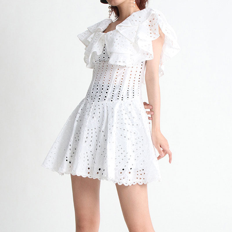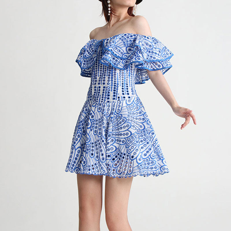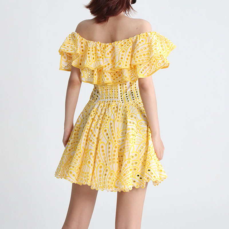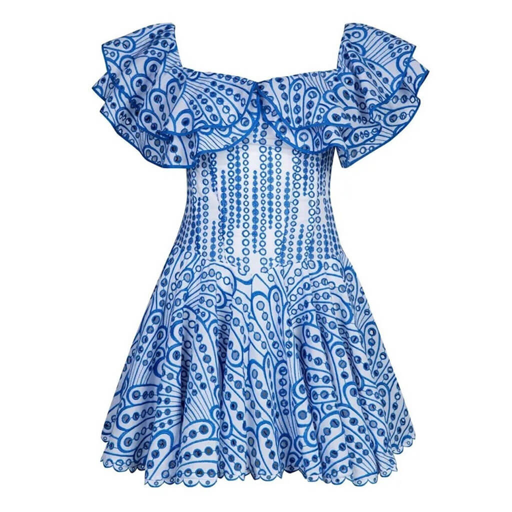 It's so good that it almost makes us wish summer would get here quicker. The broderie anglaise cutwork embroidery brings a playfulness and pop of fun to your summer outfit. Featuring a layered. ruffled off-the-shoulder neckline. our designer dress showcases darted seams and a shirred back to create a cinched waist before cascading down to a flirty mini skirt. which gives you unique summer fun. It's fastened by the concealed zip closure for easy on. The best part about this summer dress. too. is that you can keep it casual or dress it up. It can be worn with endless possibilities with just a few styling tweaks: heels or flip-flips. depending on the vibes.