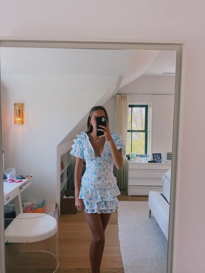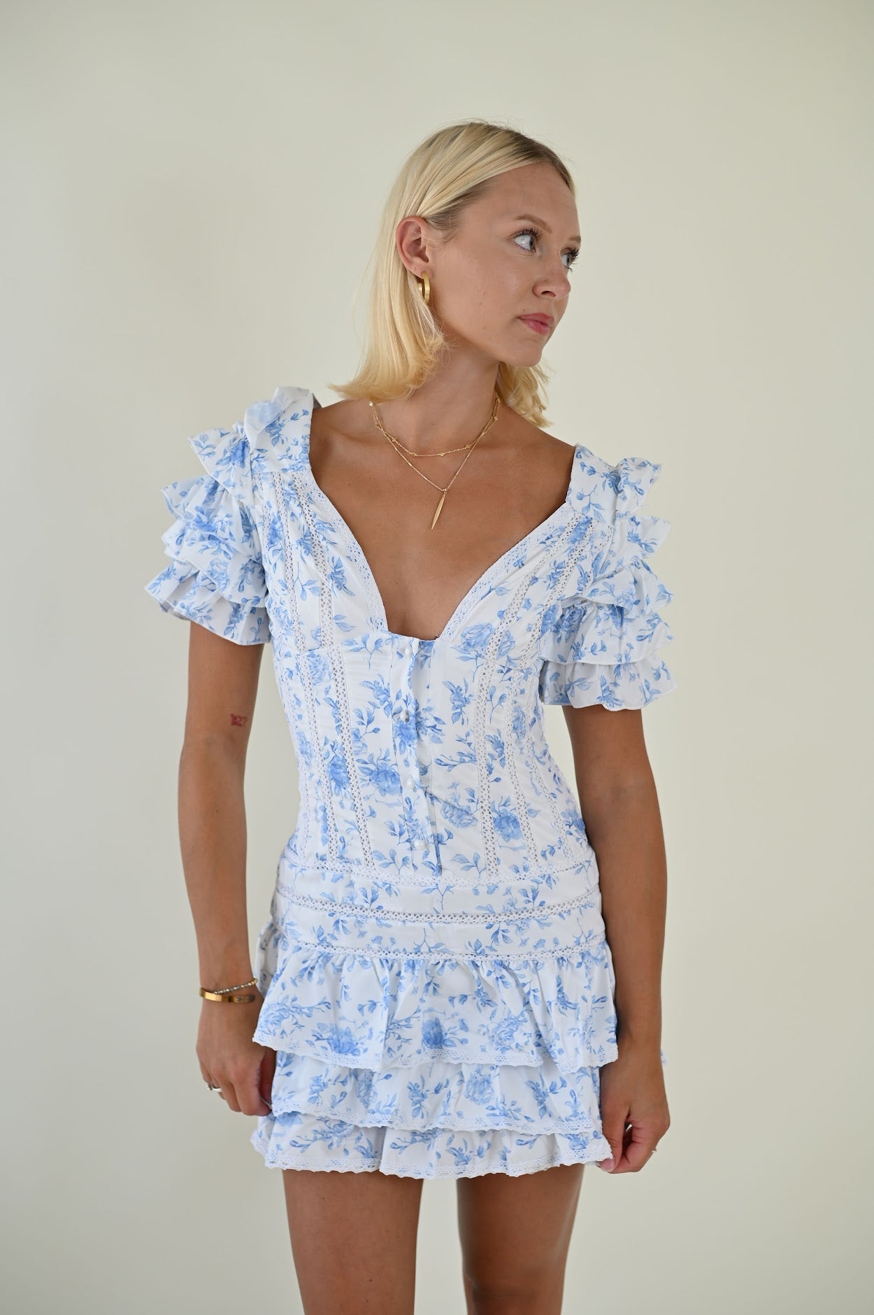 Introducing our Dream Sky Dress: Capturing the essence of serene blue skies and fluffy clouds, this enchanting mini dress features a delicate blue floral pattern reminiscent of a pastoral painting. It's designed with flirtatious ruffle sleeves and a tiered skirt for a playful, feminine look. The sweetheart neckline and subtle bust cinching enhance your shape, while the lightweight fabric ensures comfort on warm days. Perfect for picnics, brunches, or daytime outings, this dress pairs beautifully with sandals for a casual vibe or heels for a dressed-up look. Embrace a blend of classic elegance and whimsy with the Dream Sky Dress.