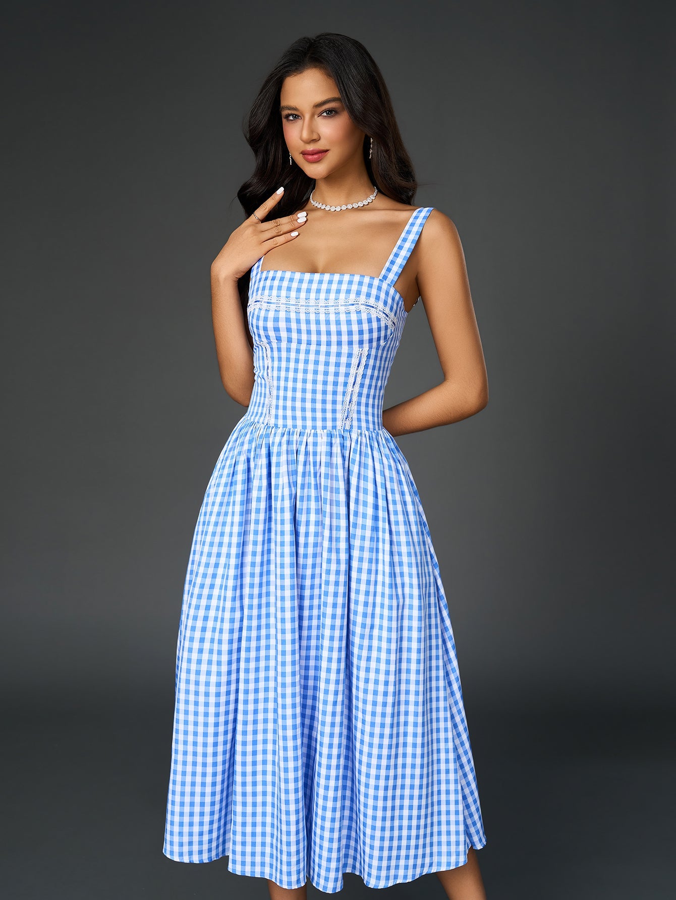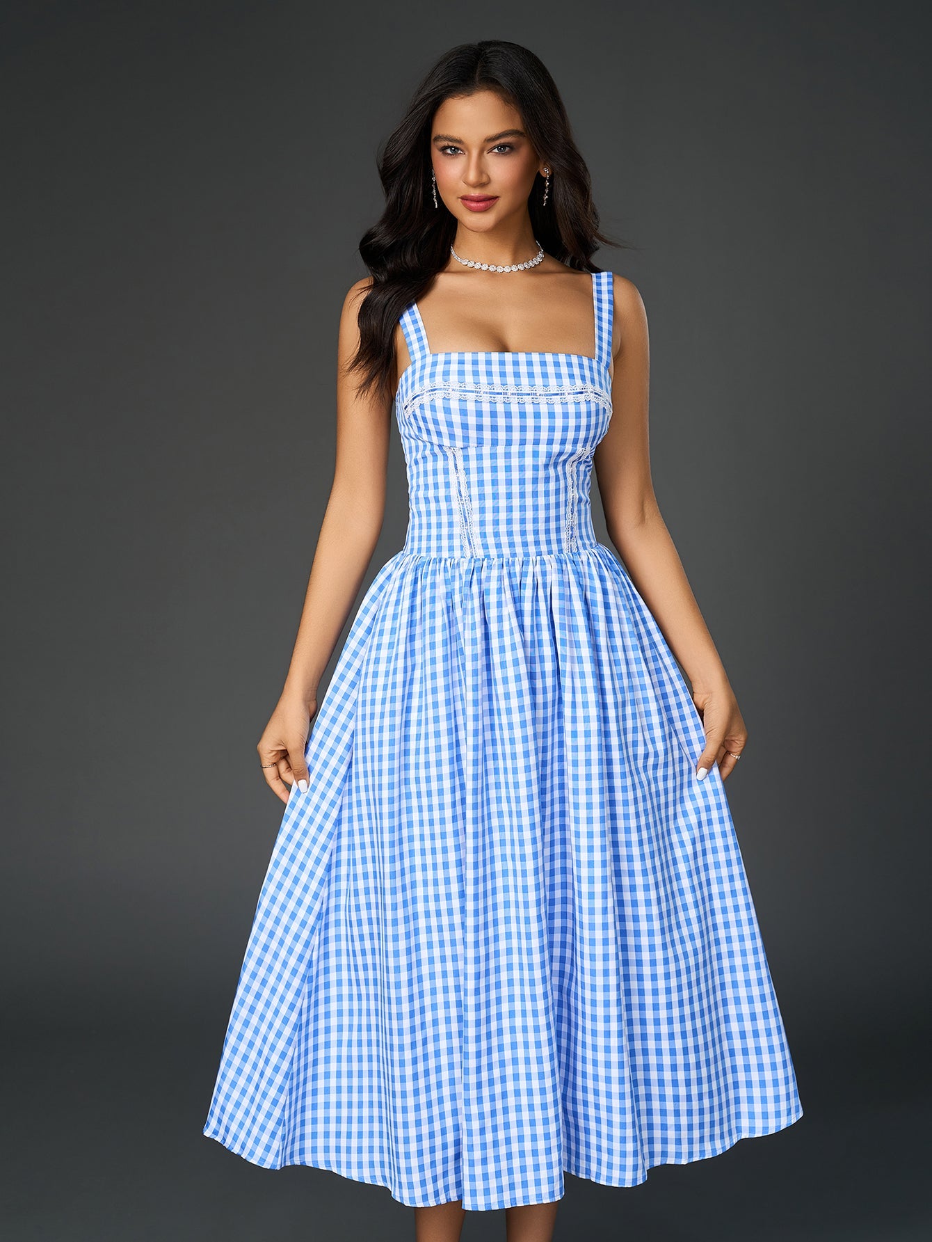 Embellished Lace Trim Pocket Plaid Print Midi Dress