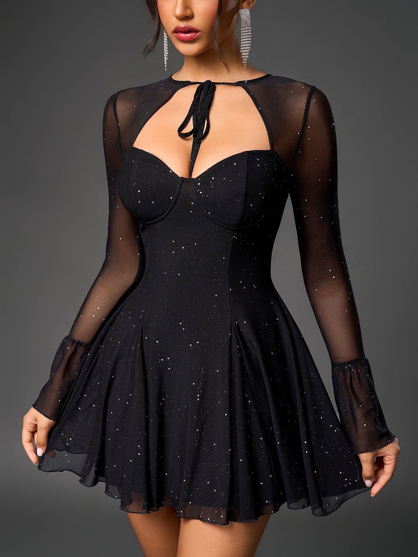 Flounce Sleeve Tie Front Glitter Mesh Flared Dress