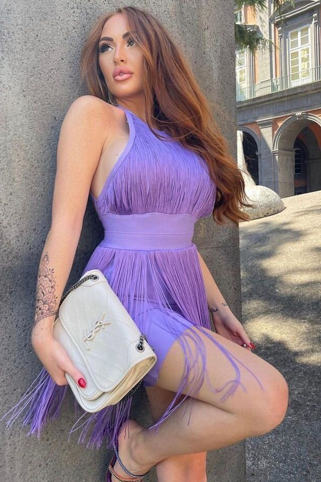 Crafted with meticulous attention to detail, the halterneck silhouette gracefully accentuates your shoulders and neckline, creating a captivating and feminine allure. The backless design adds an alluring touch, showcasing your back and adding a hint of sensuality to your ensemble. The sleeveless construction allows for freedom of movement, ensuring you can dance the night away with ease and comfort. The fringed detailing adorns the hemline, adding a playful and eye-catching element that sets this dress apart from the rest.