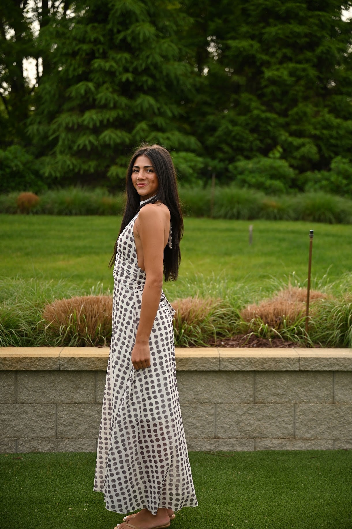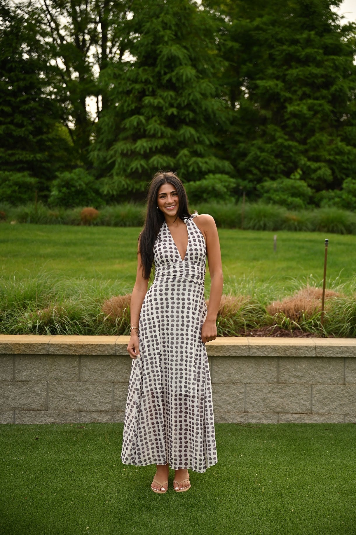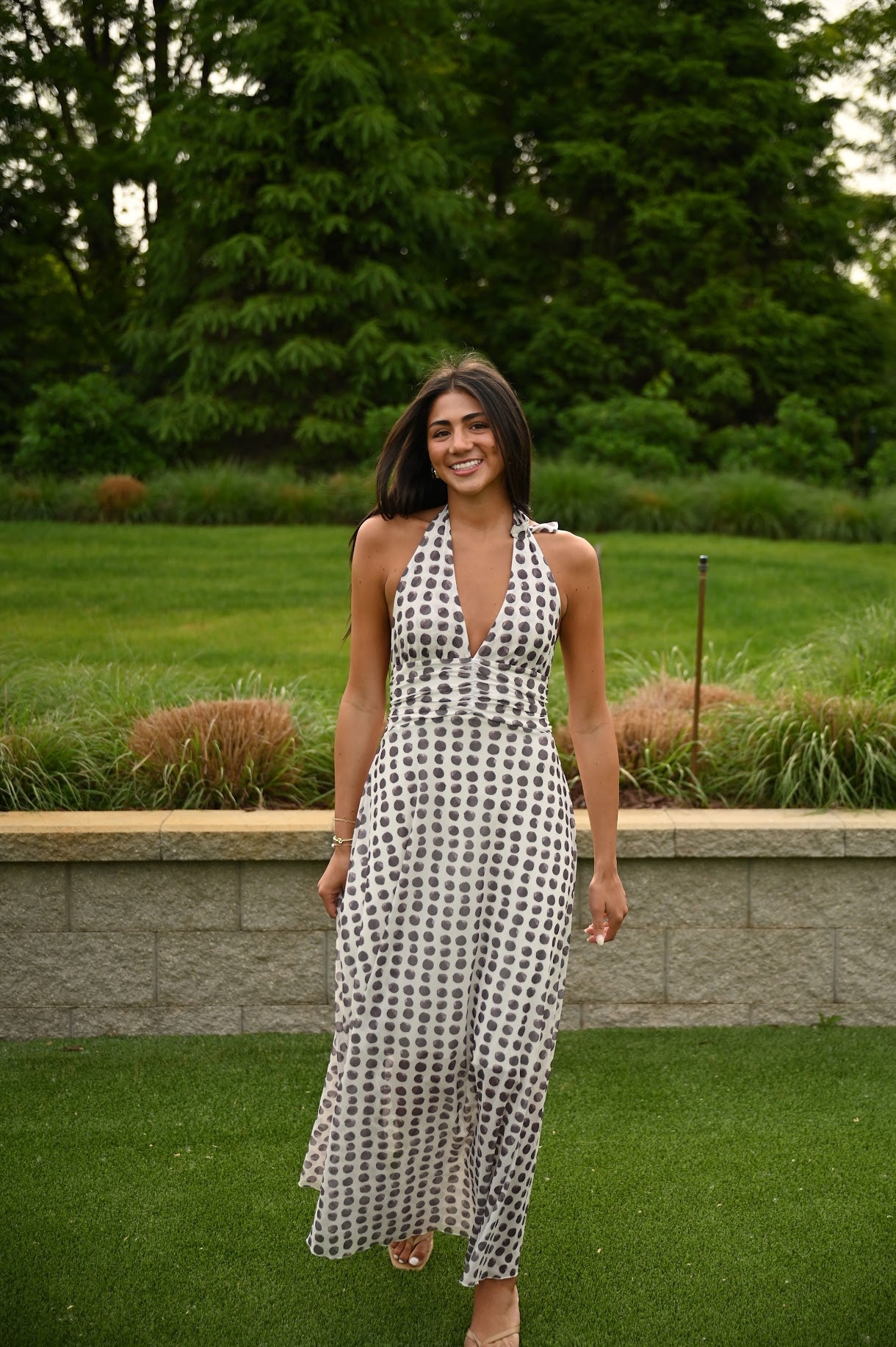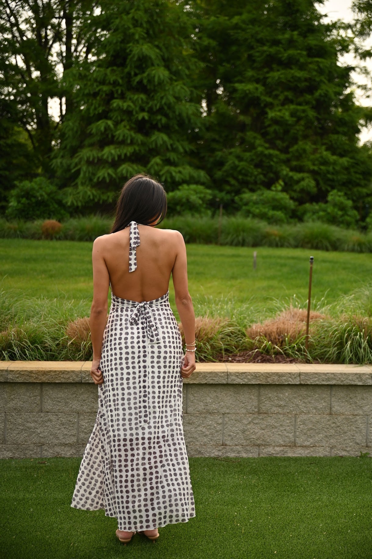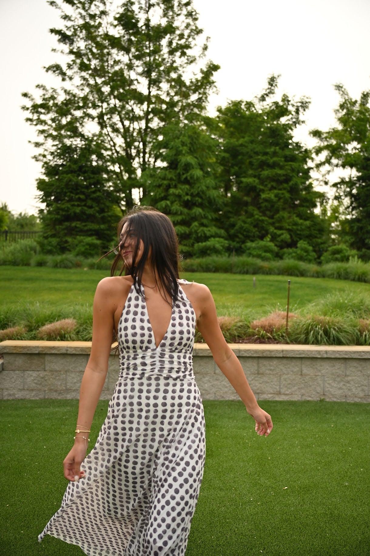 Rock that retro vibe in our Hotel dress! This polka dot v neck maxi dress will turn heads with its playful print and flirty open back. Don't miss out on this chic and charming addition to your wardrobe!