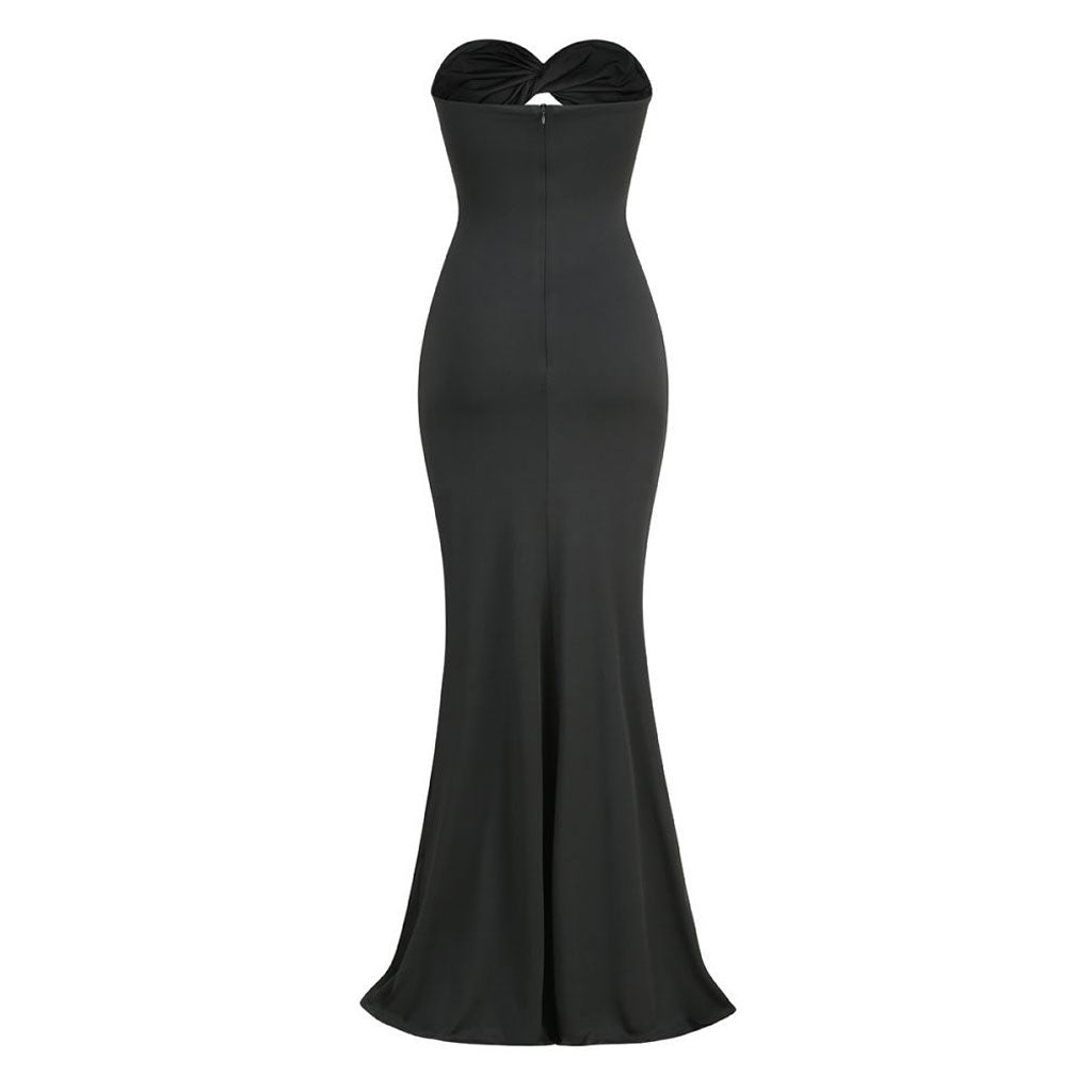 This mermaid gown is a classic pick for formal events. The designer dress is a very figure-flattering style as it hugs every single curve from the bust to the knees. fitting close to the skin. It makes an instant statement with eye-catching details like the twisted sweetheart neckline. front cut-out and all the ruched style that's highlighted by the draped frill design here. It's fastened by a hidden rear zip closure and descends through the thigh and knee which flares out in a wide. relaxed finish. Wear yours with sky-high heels and a clutch bag which gives you styles and pleasures simultaneously.