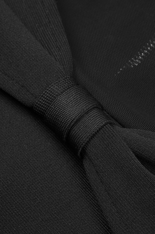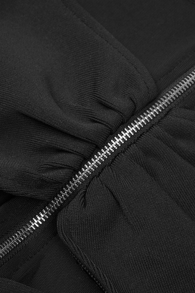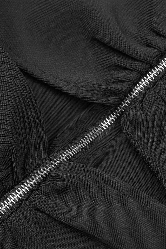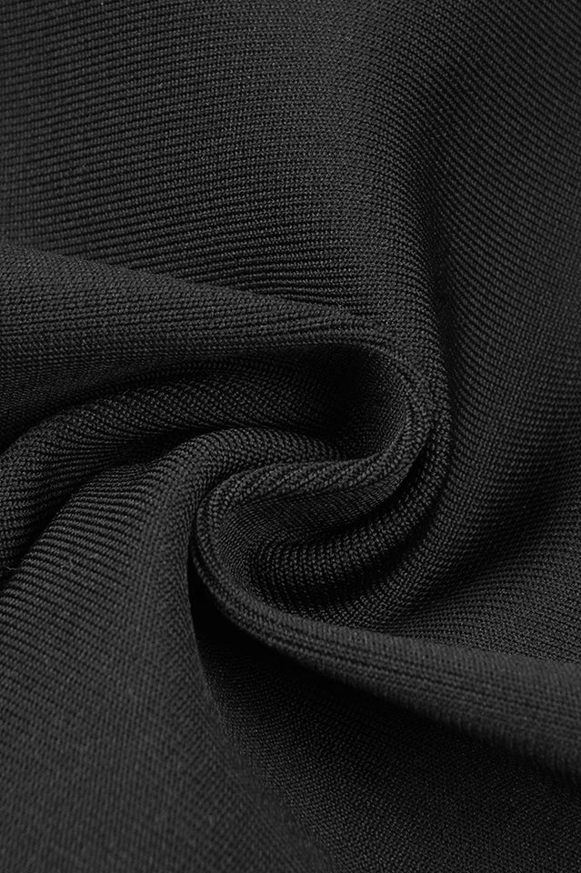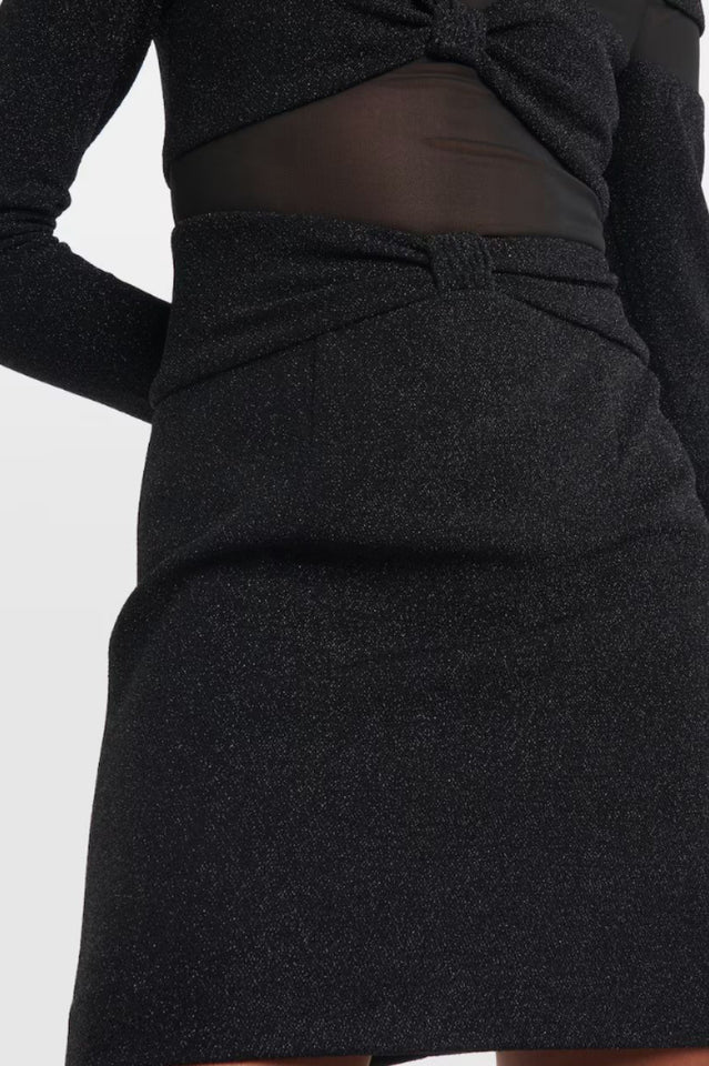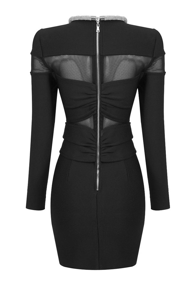We puts a twist on a classic black minidress with the Simone style. Made with metallic fibers for a dazzling finish, the mesh-paneled piece features a necklace-inspired embellishment at the neckline.