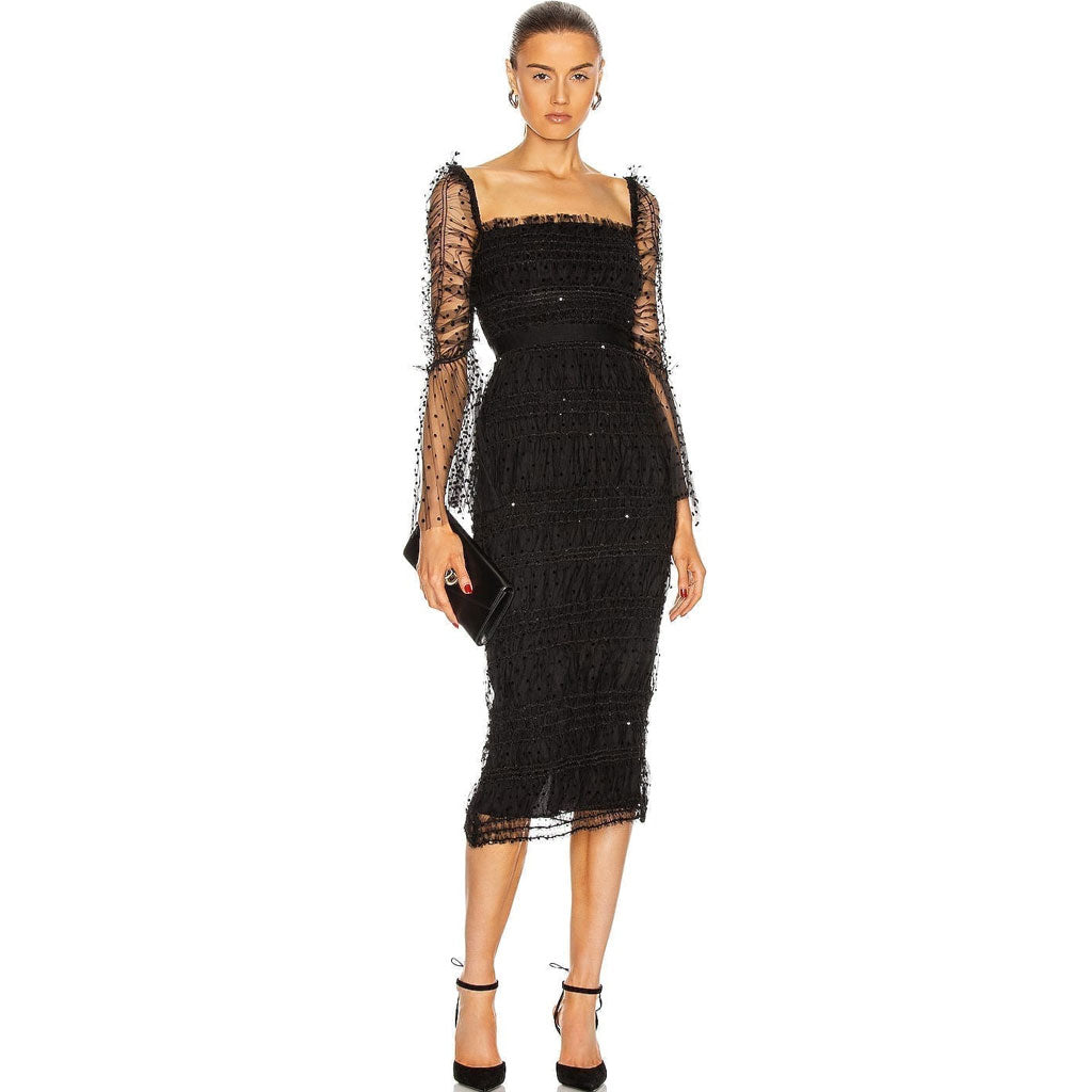 Sparkly Sequin Flocked Dotted Tulle Cocktail Midi Dress - Black