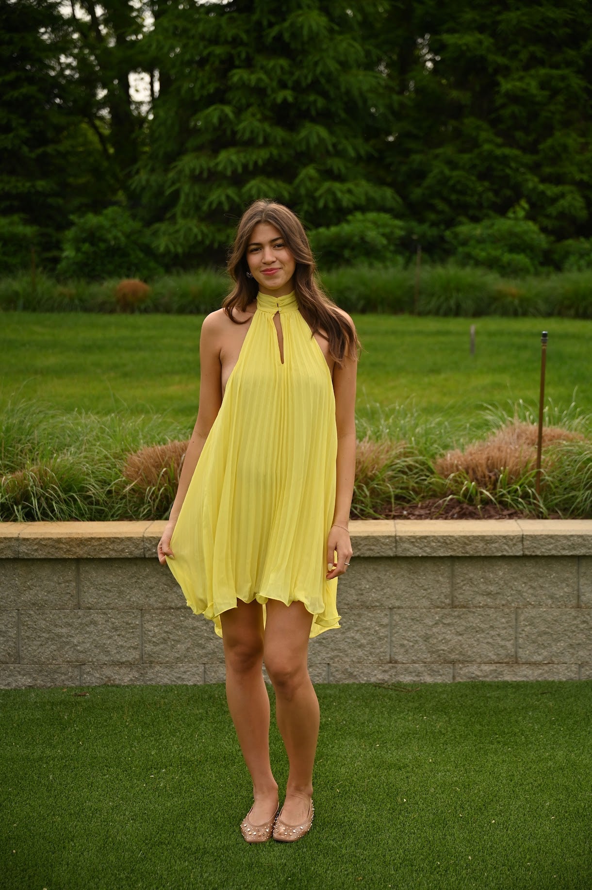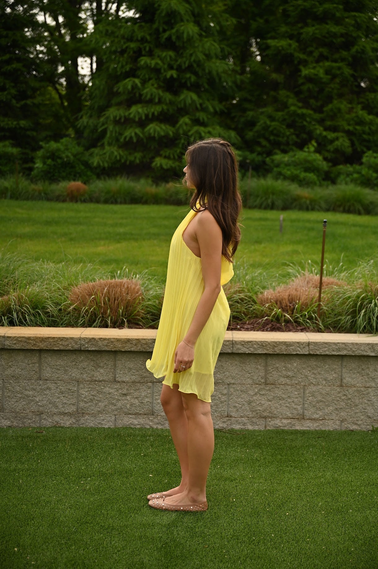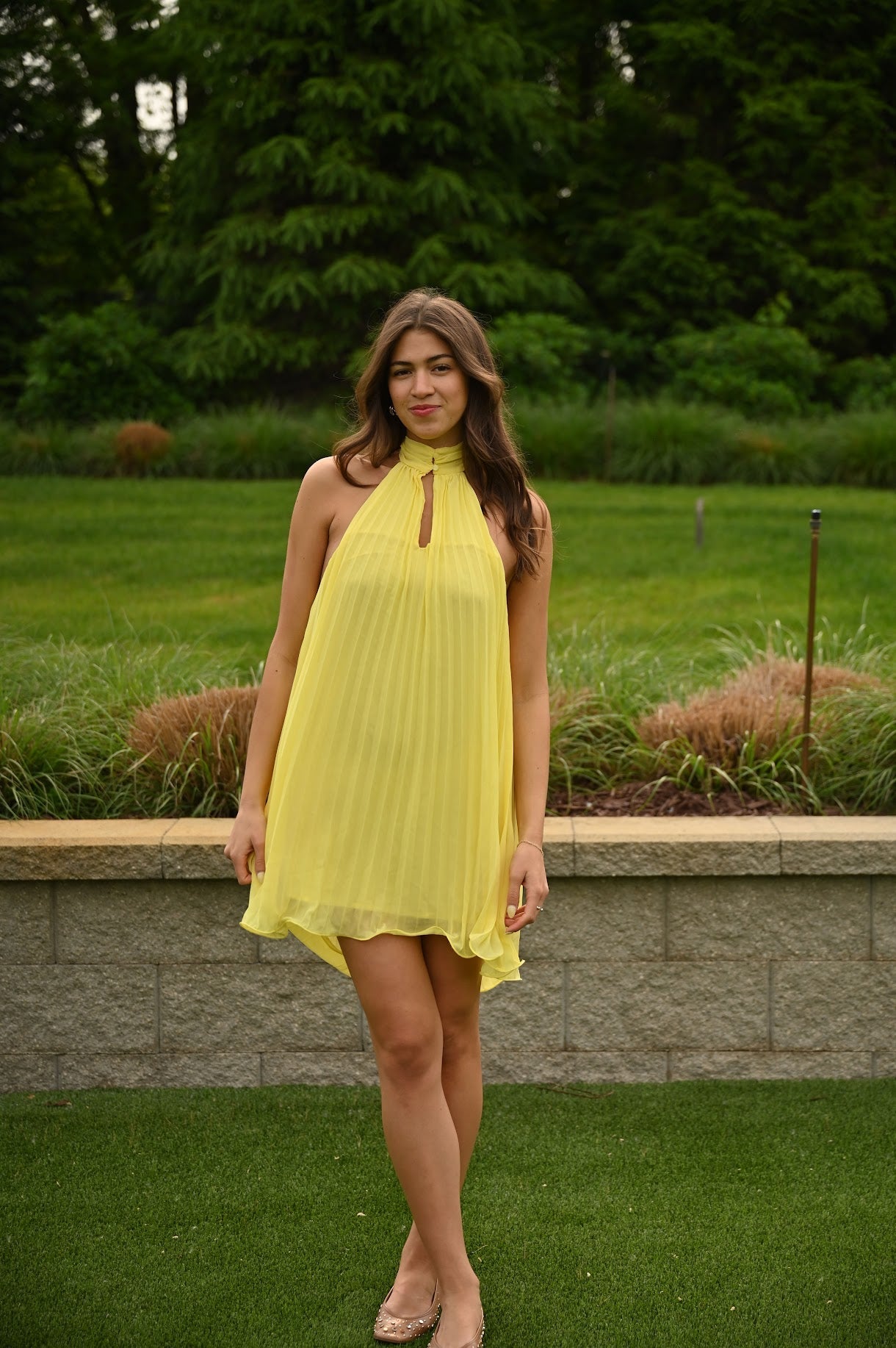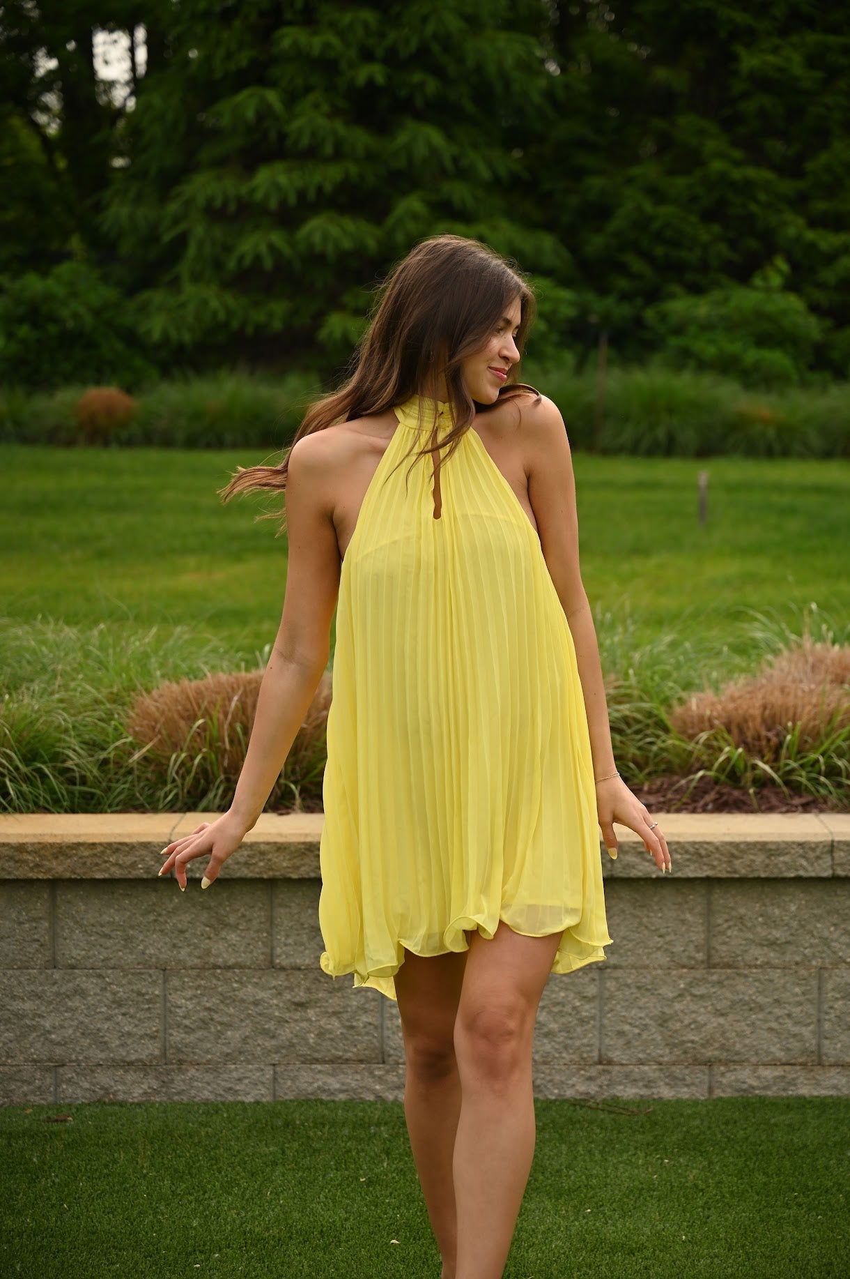Brighten your day with the Sunset Sweetheart Dress, featuring a charming high neck and a sunny yellow hue. This playful dress adds a splash of sunshine to any occasion, perfect for twirling through warm afternoons or making a cheerful statement wherever you go. Embrace fun and flair with this delightful wardrobe essential.