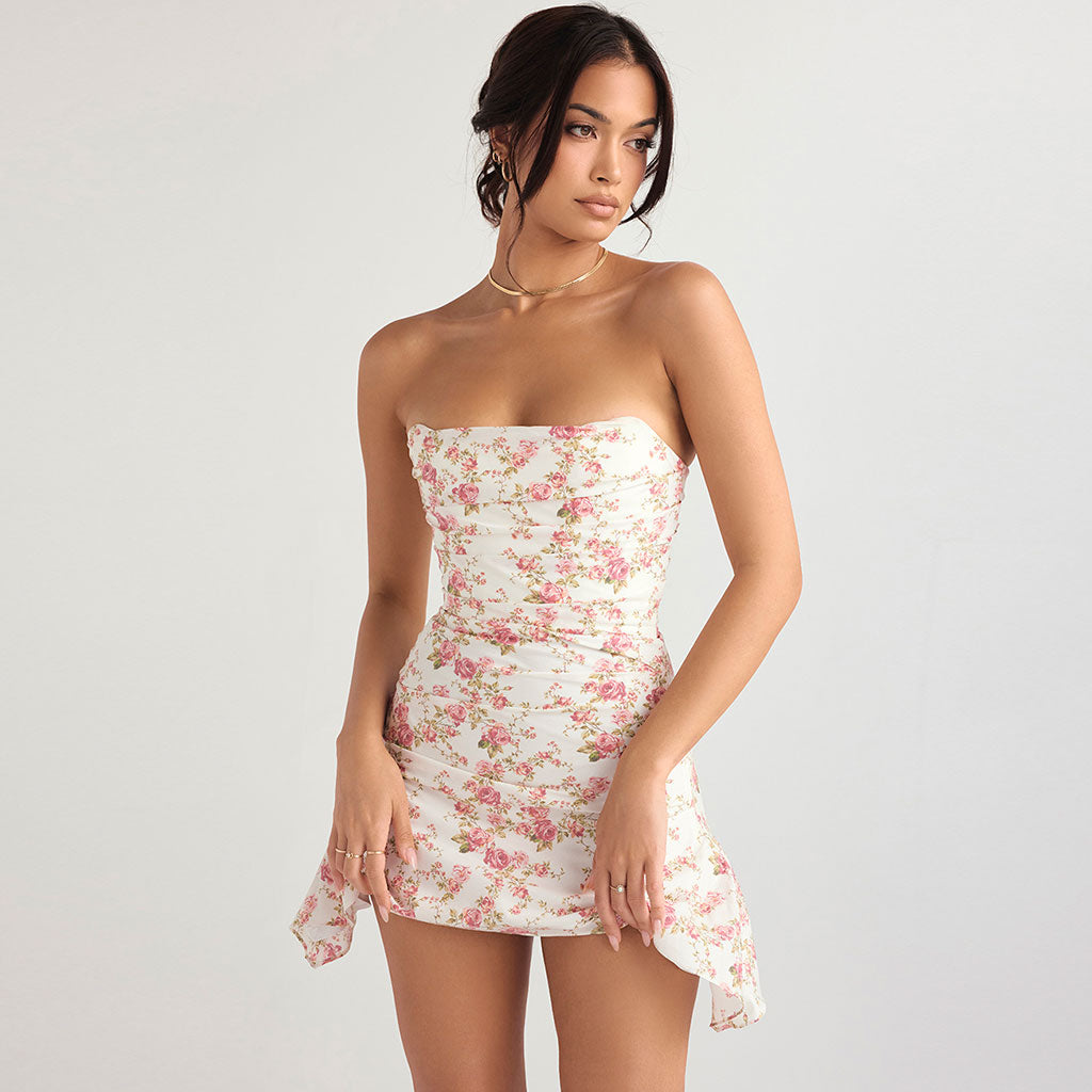 Sweet Floral Strapless Pleated Corset Draped Satin Mini Dress - Pink