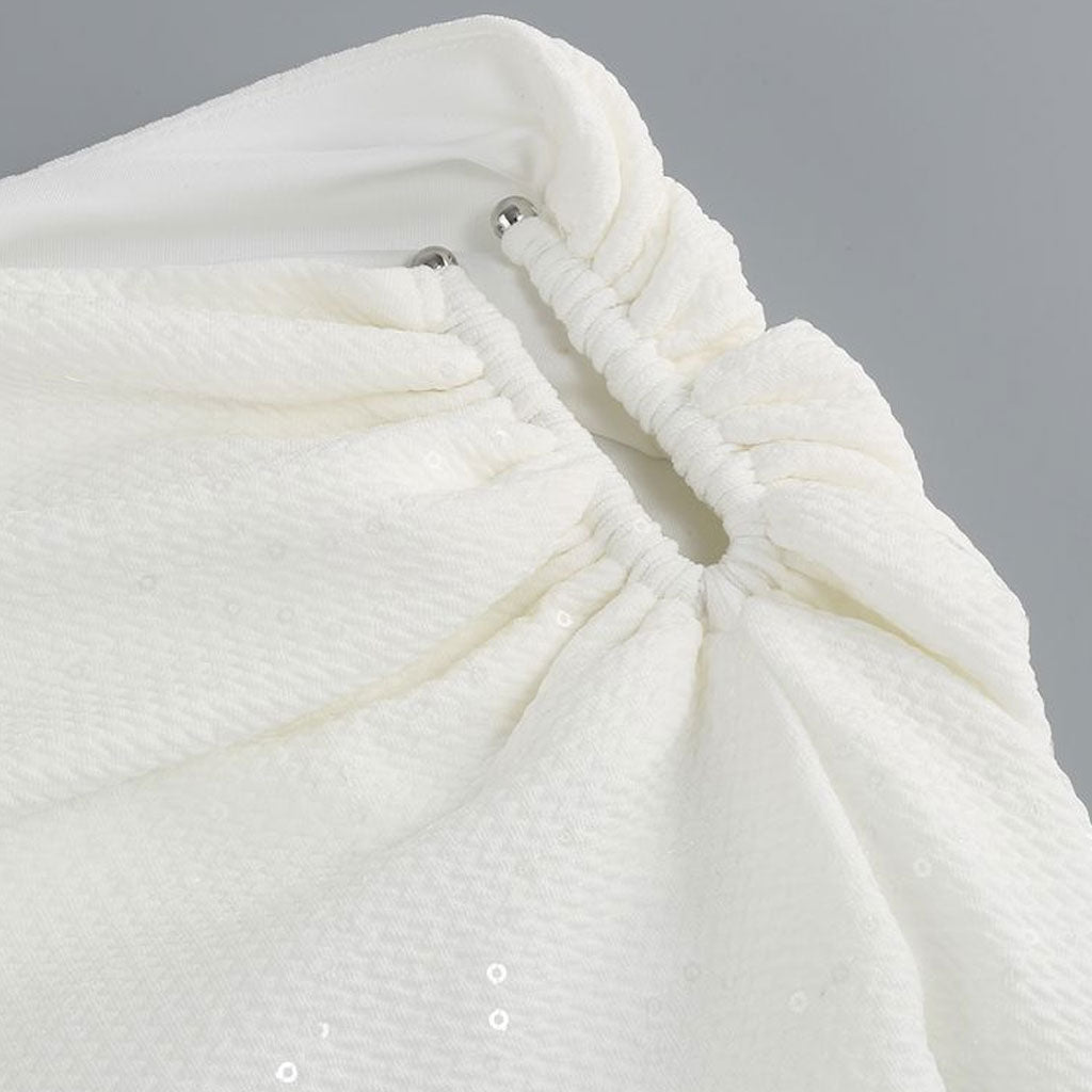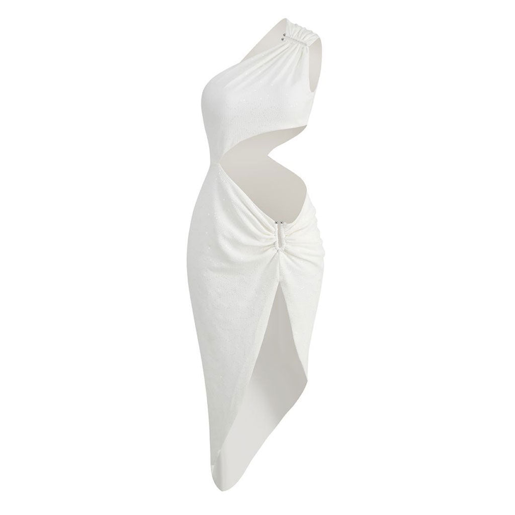 This texture will definitely make any all-white outfit look 10 tines more interesting. The glamorous white dress from our new designer collection is sprinkled with sparkly sequins that are only noticeable when they catch the light. The unique textured fabric looks pricier than it is. The cutout on the waist. asymmetric one-shoulder neckline. and thigh-high split make this gorgeous dress with a sexy vibe. The ruched-hip and shoulder that are all formed by the metal ornament can be a simple way to trick the eye and give you a fitted hourglass silhouette. Simultaneously avant-garde. this midi dress is finished with an asymmetrical hemline which is surely worth the investment. It's a chic choice for dinners and events. This is the perfect dress you'll rule everyone's Instagram feeds wearing. Add a small clutch and heels when you're ready to head out.