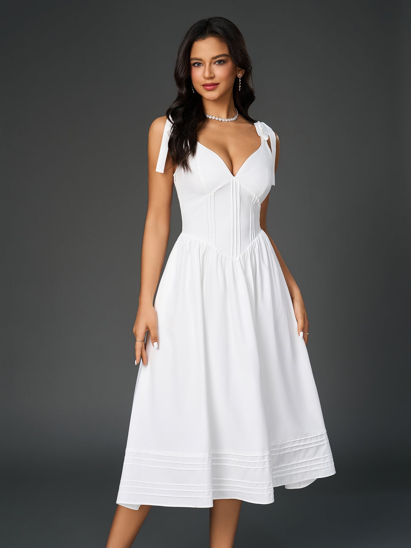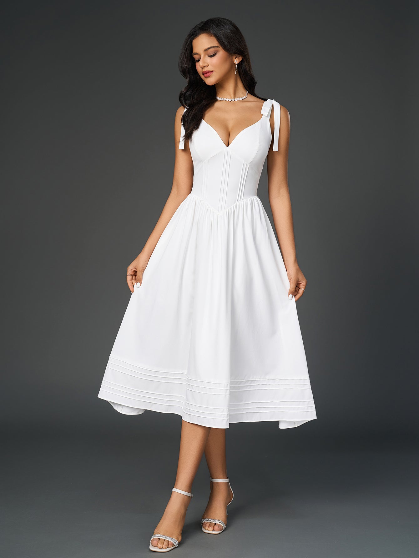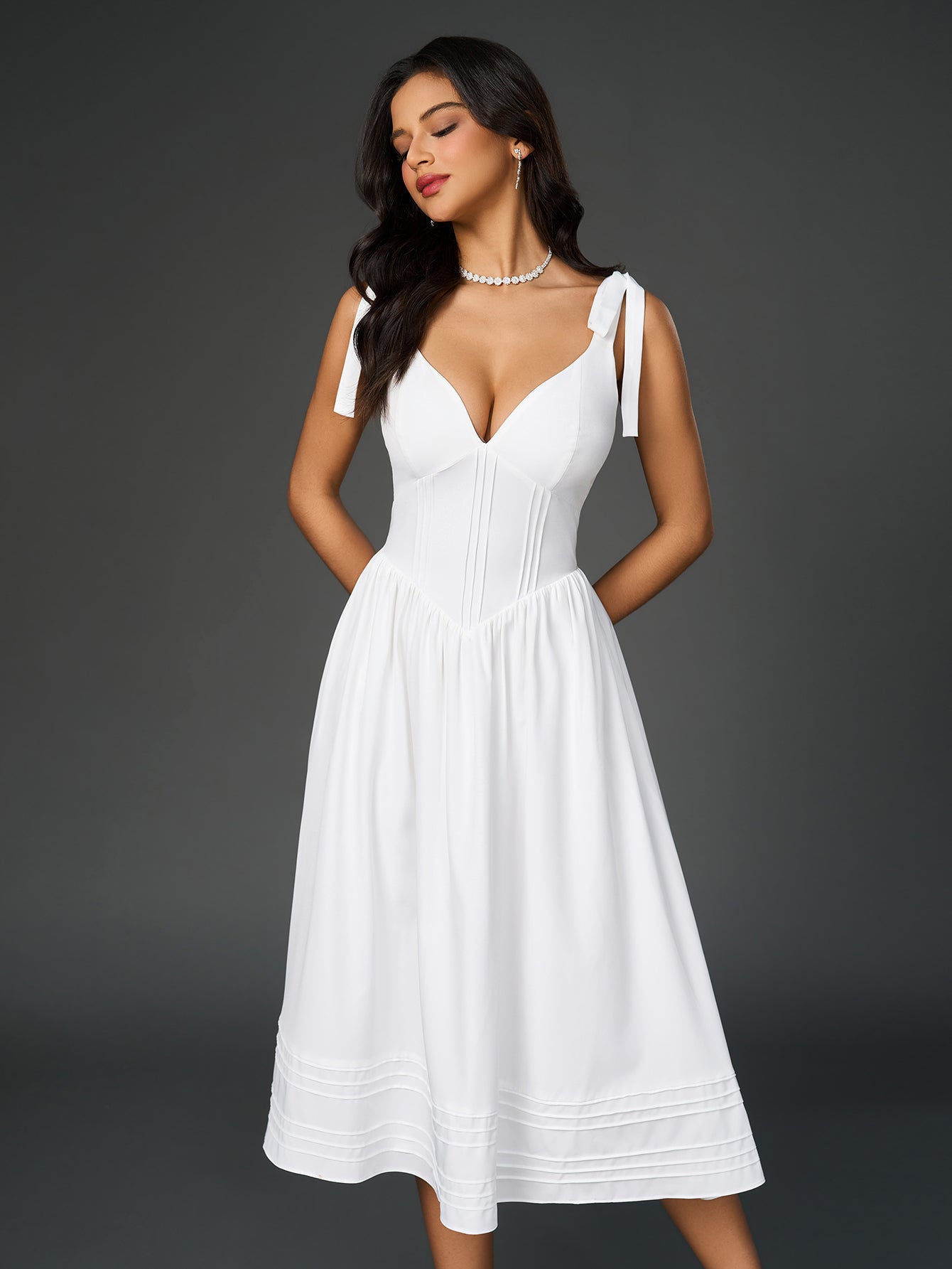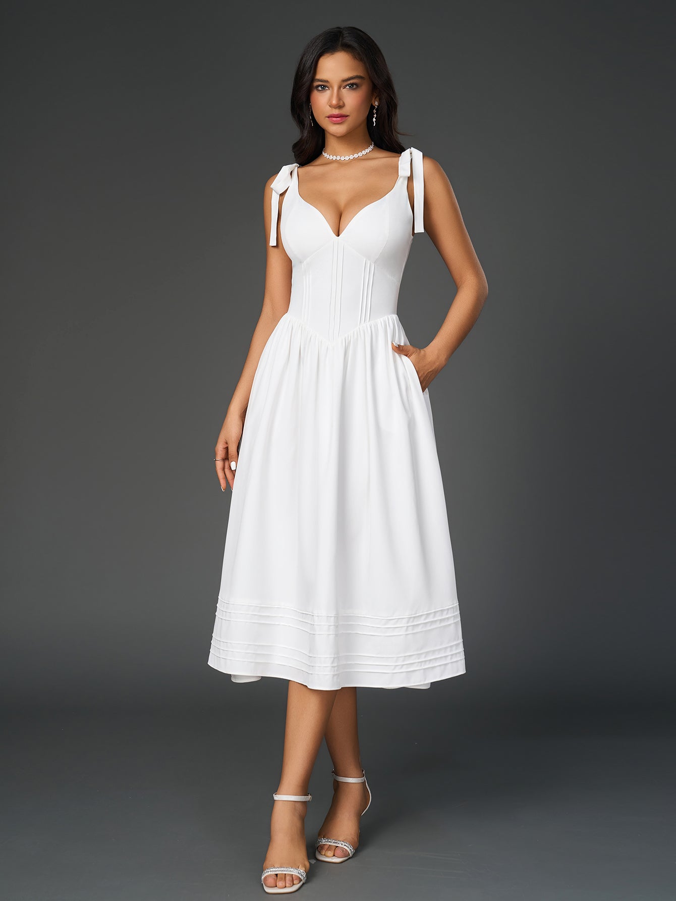 Tie Shoulder V-Neck Pleated Pocket Solid Dress