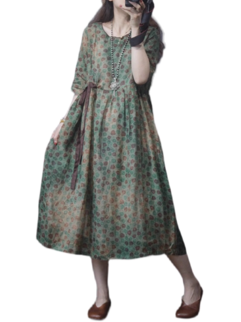 Elevate your style with our Women's Printed A-Line Dress. a perfect blend of comfort and charm. Crafted from Ramie. its lightweight and breathable material ensures a chic look. The round neck collar and five-quarter sleeves exude simplicity with a touch of sophistication. Available in a soothing green hue. this dress is a versatile addition to your wardrobe. Choose from sizes S. M. L. and XL. each meticulously designed to provide a perfect fit. Detailed size dimensions include shoulder width. bust. sleeve length. and dress length. Embrace timeless elegance with this A-line dress. seamlessly blending fashion and comfort.