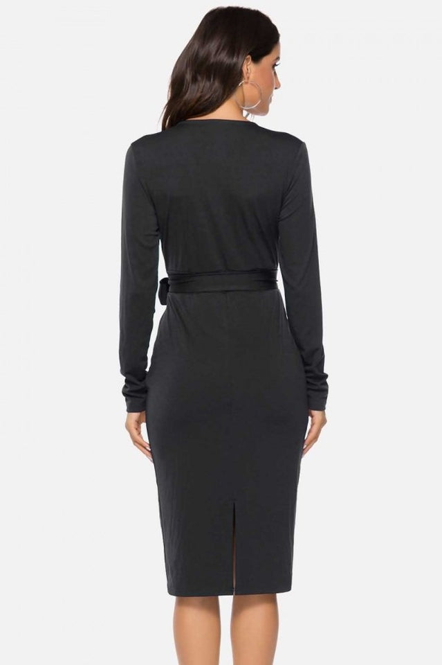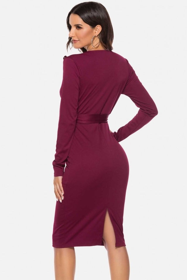 V Neck Wrap Tied Waist Slit Dress