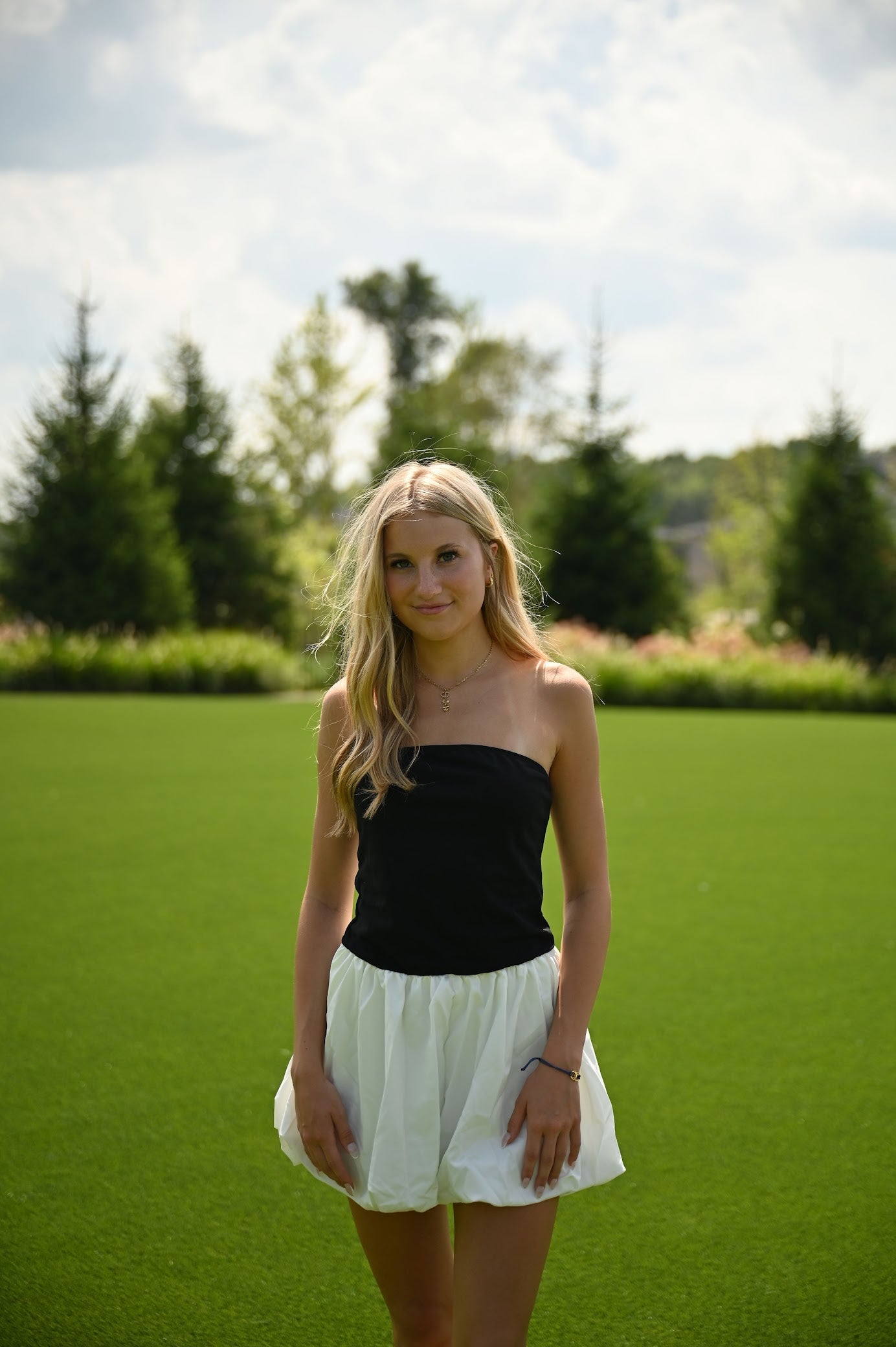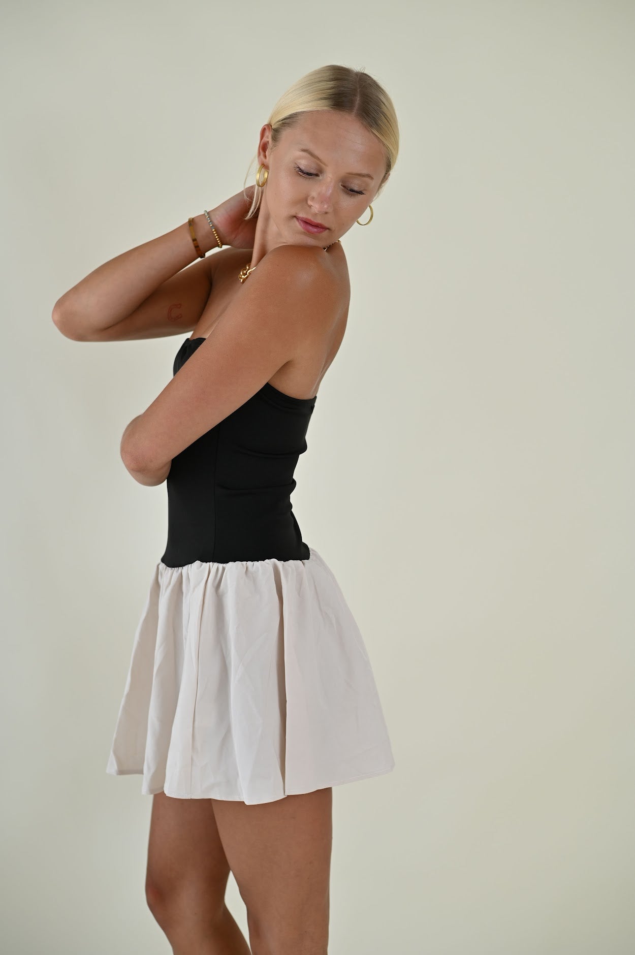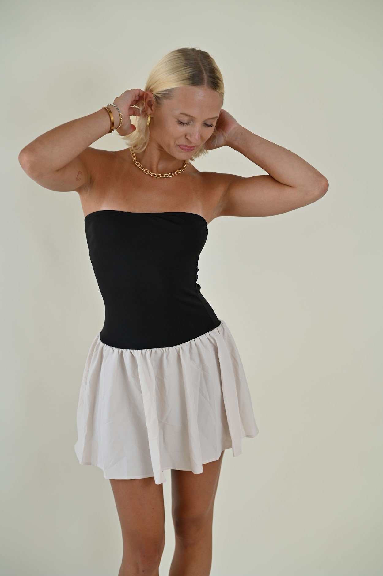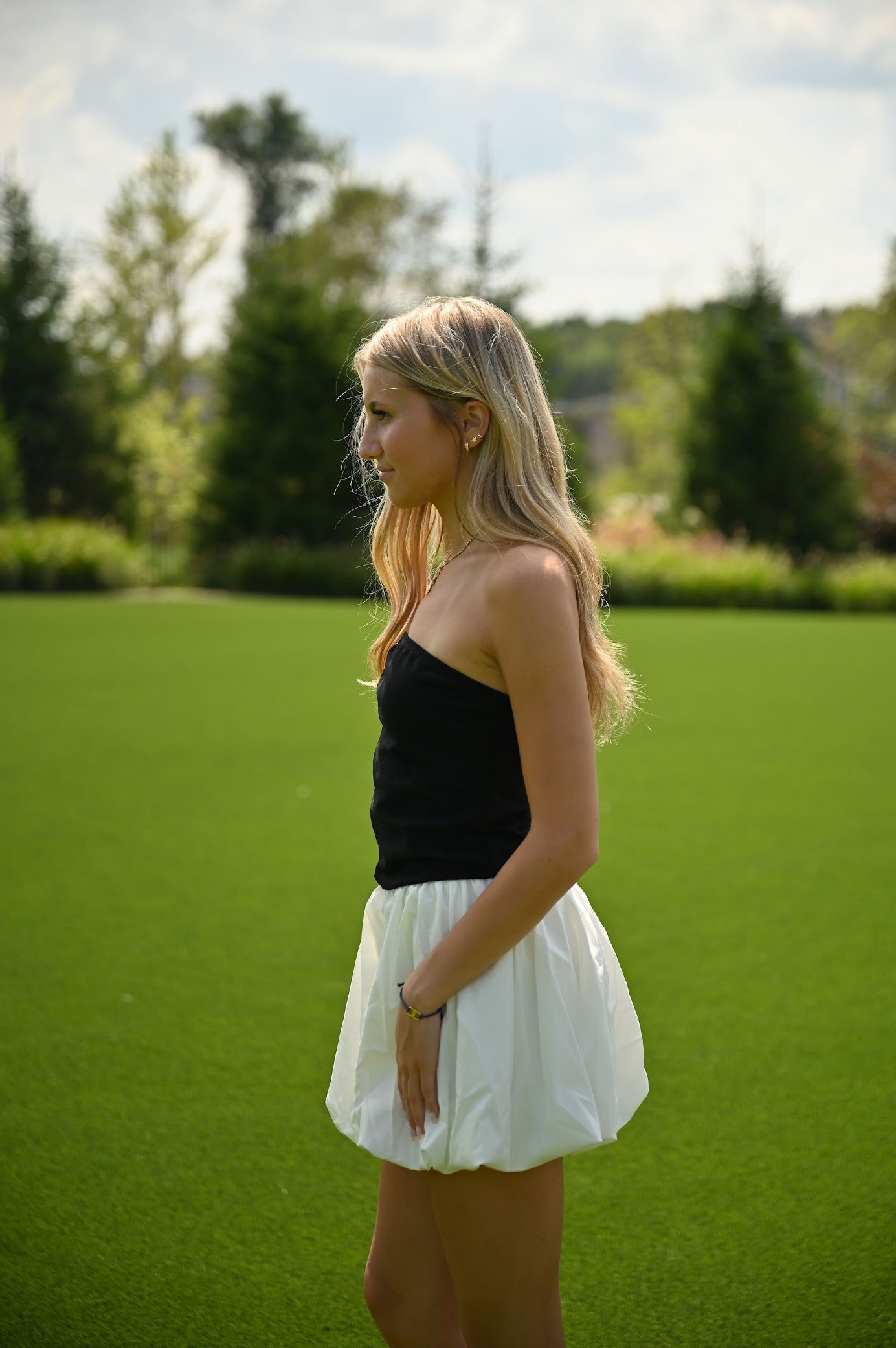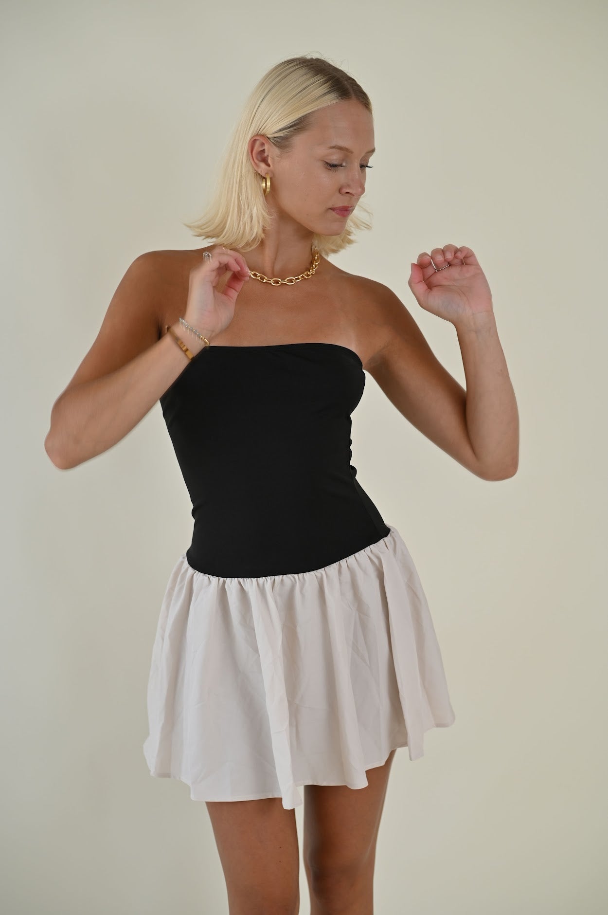 Turn heads with this chic and flirty strapless dress! Featuring a sleek black bodice and a playful, flared white skirt, it effortlessly combines sophistication with fun. Perfect for a night out or a stylish day event, this dress offers a flattering fit and a timeless black-and-white contrast. Make a bold statement!