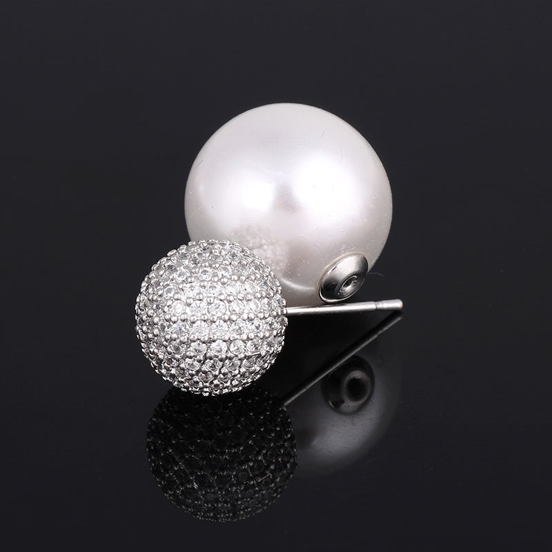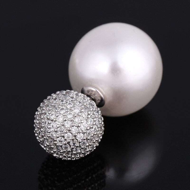 Luxury Simulated Full Prong Silver Pearl CZ Reversible Double Ball Stud Earrings
