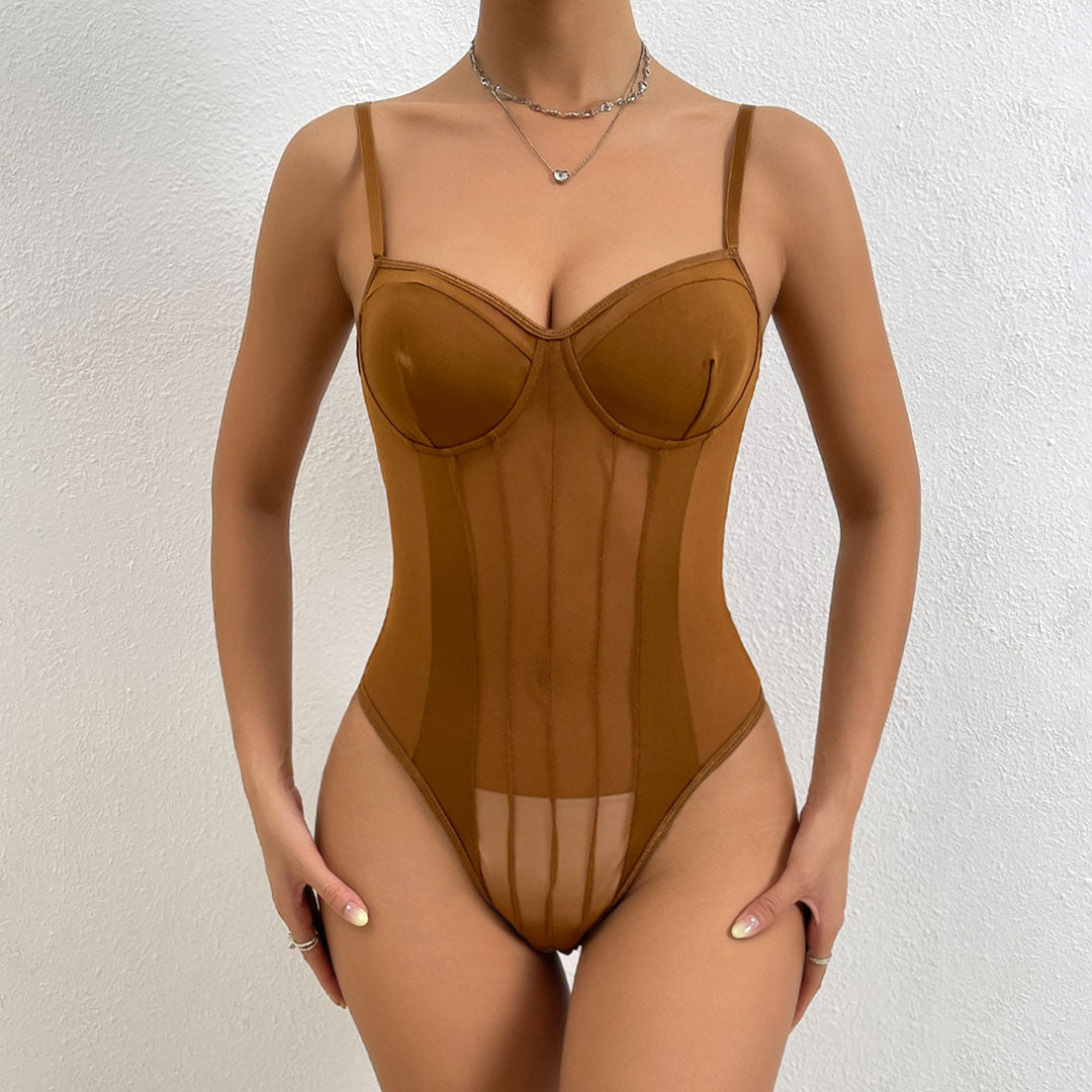 Sweetheart Vertical Striped High Leg Sheer Mesh Bodysuit - Coffee