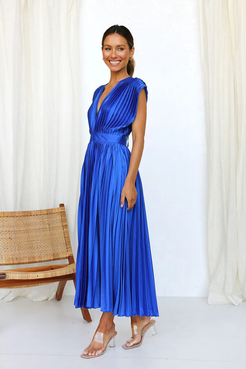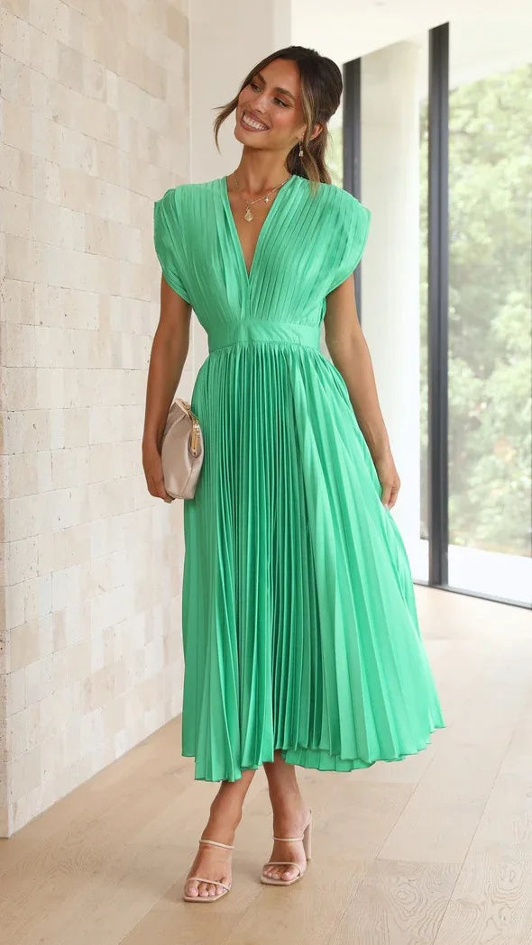 AISHA Pleated Plunge Midi Dress: Effortless Elegance and Comfort