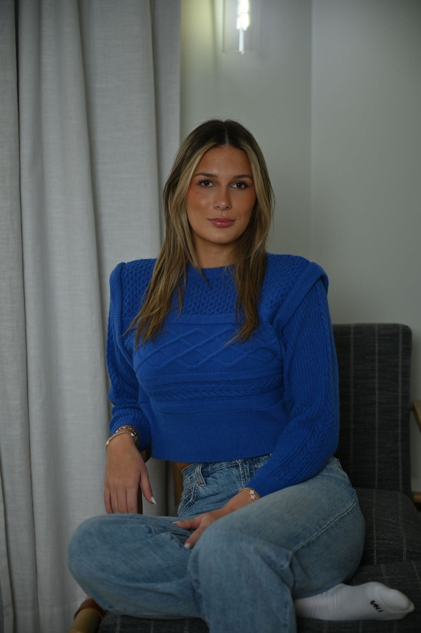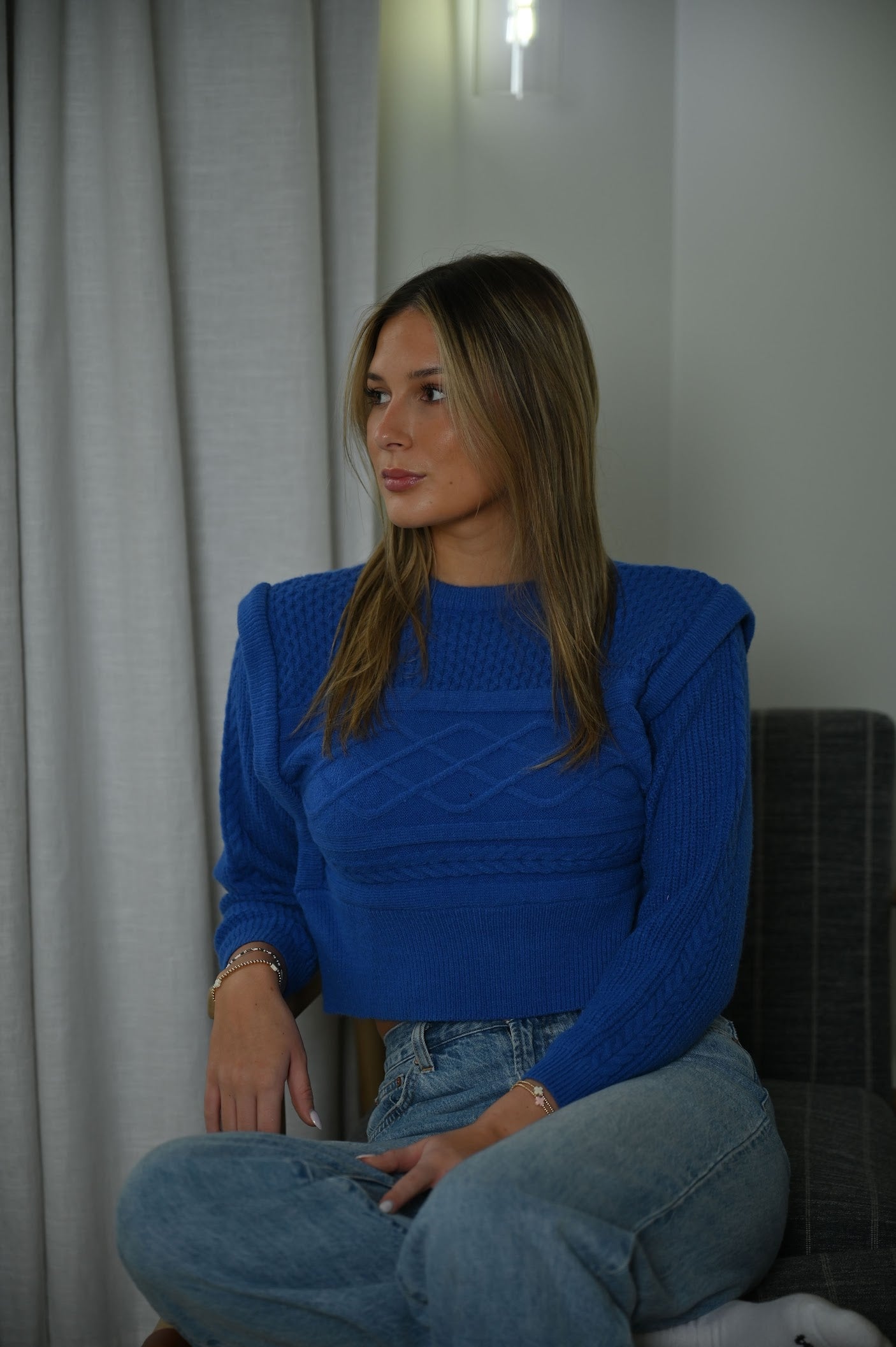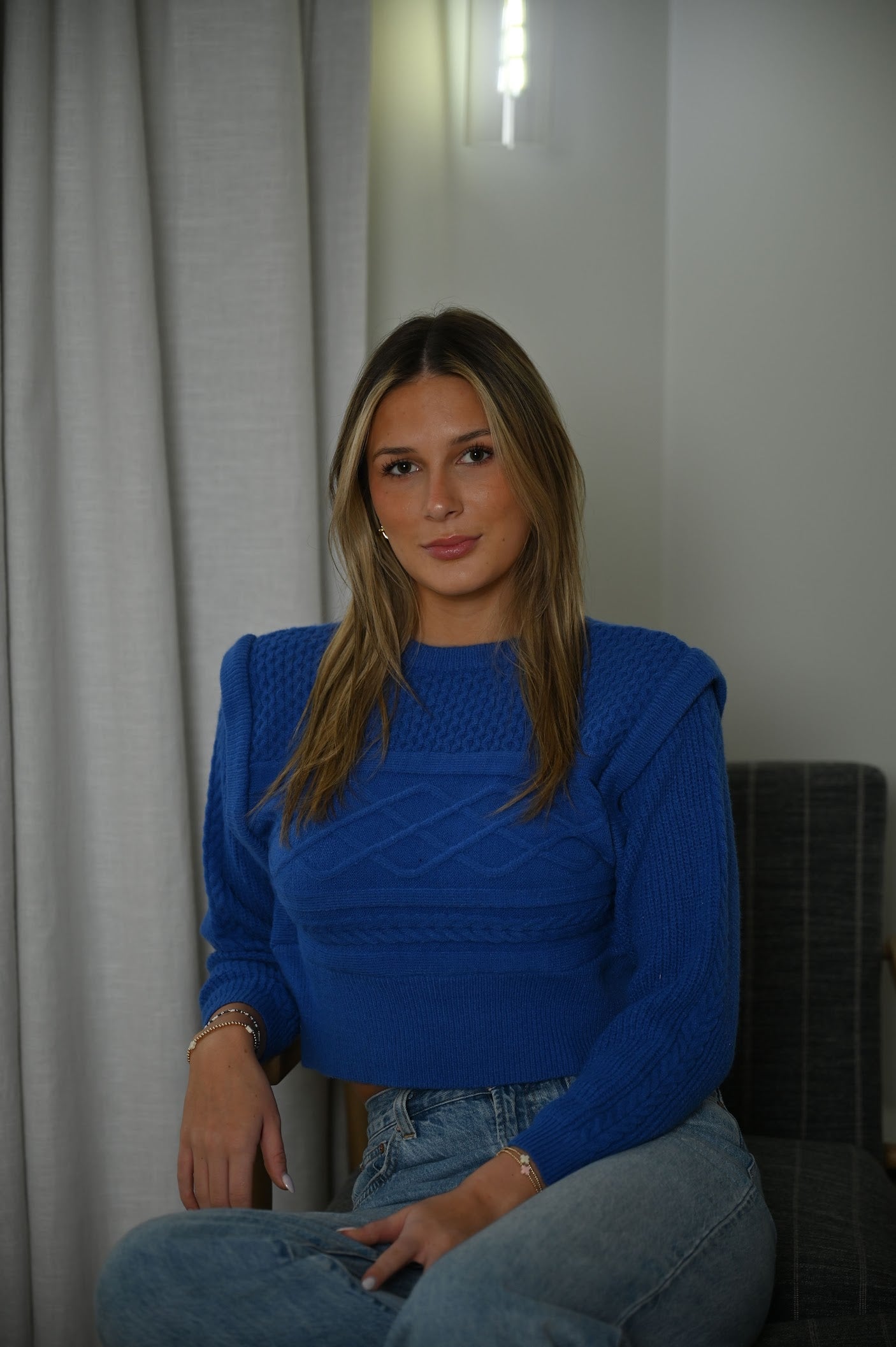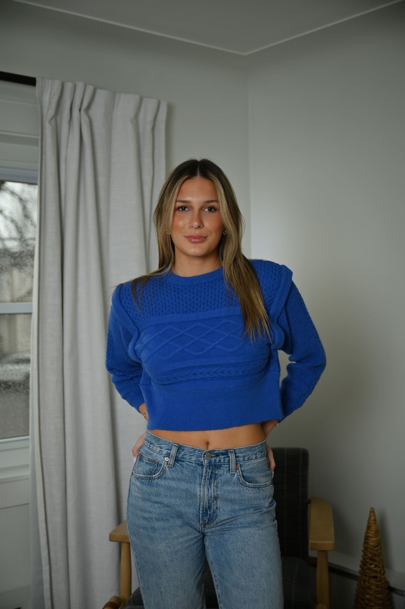 Wrap yourself in the Florence Sweater's embrace, a stunning royal blue knit that combines classic cable patterns with a modern silhouette. Its plush texture and ribbed trim offer both warmth and style, while the puff sleeves add a touch of sophistication to your winter wardrobe. Perfect for chilly days.