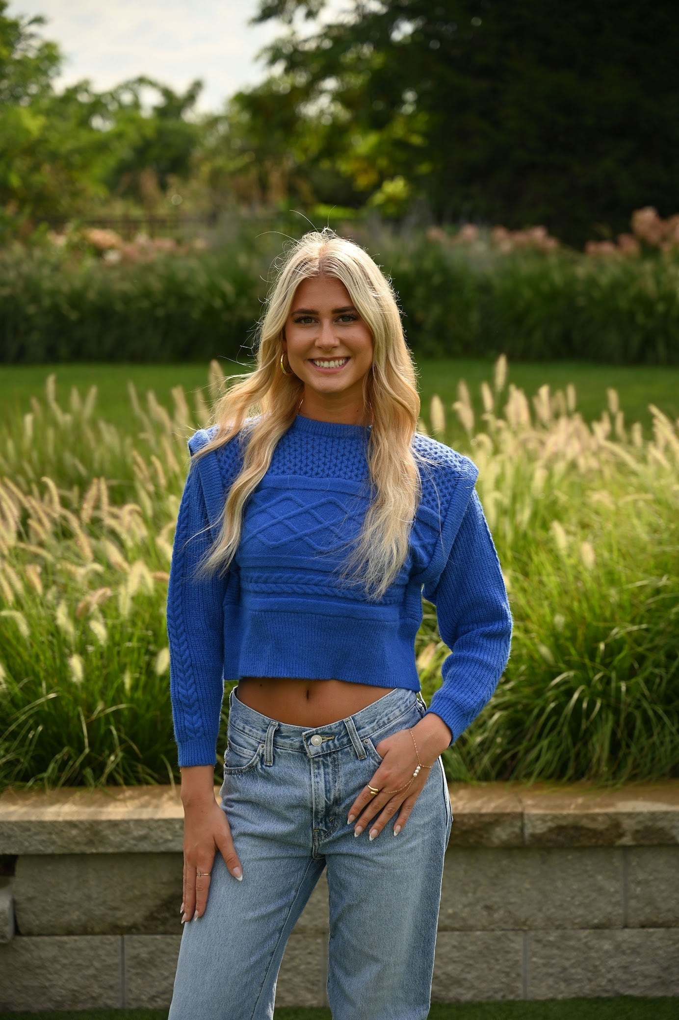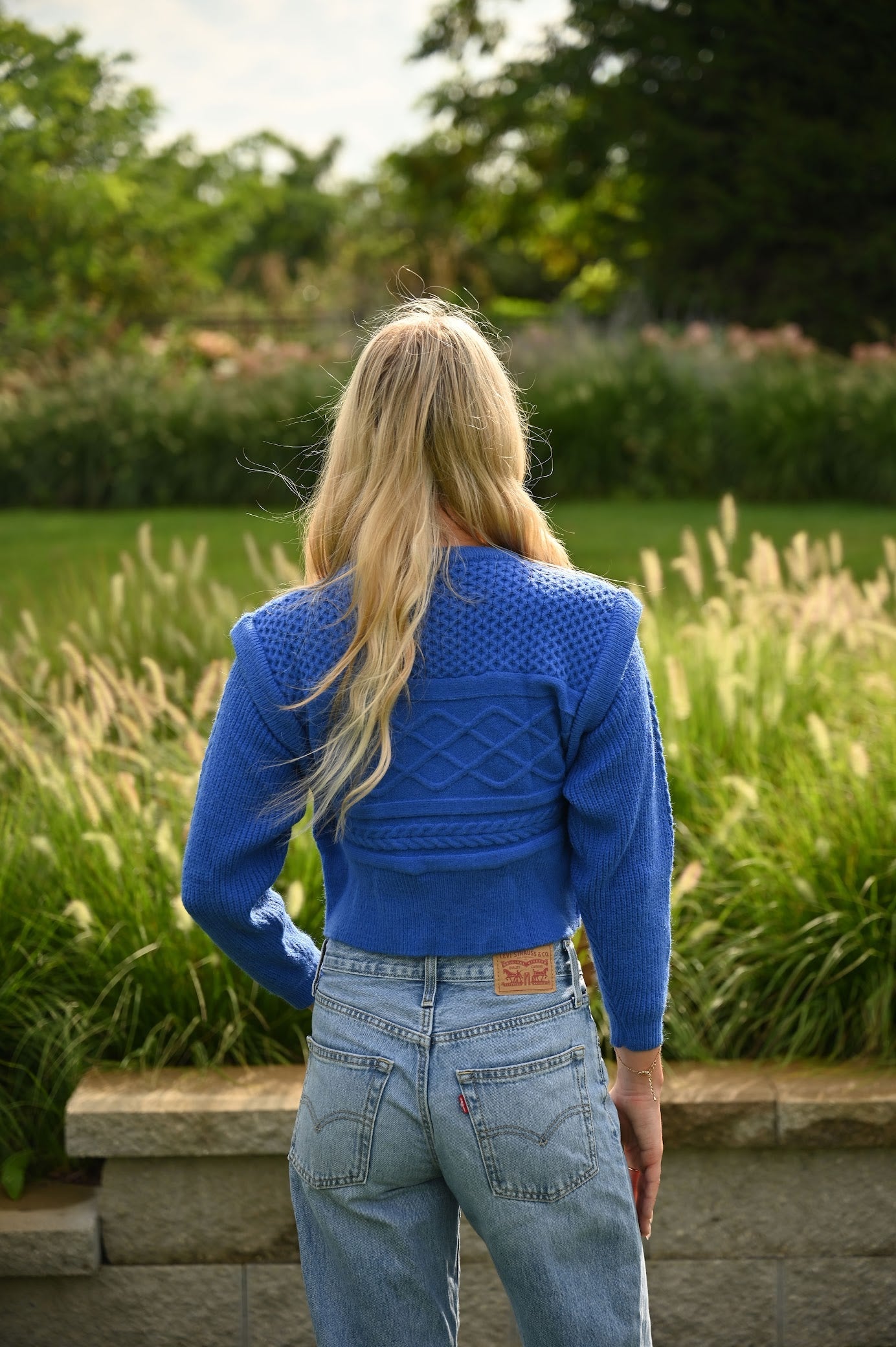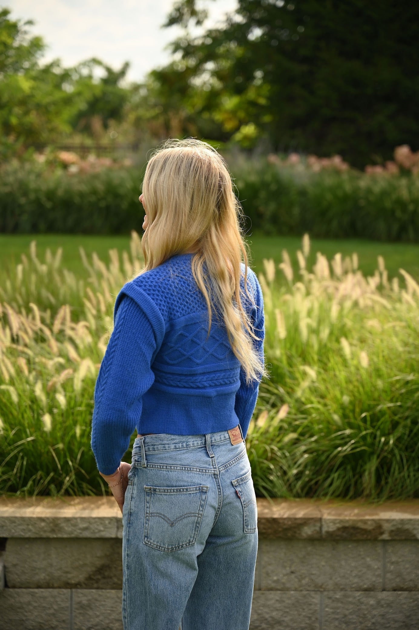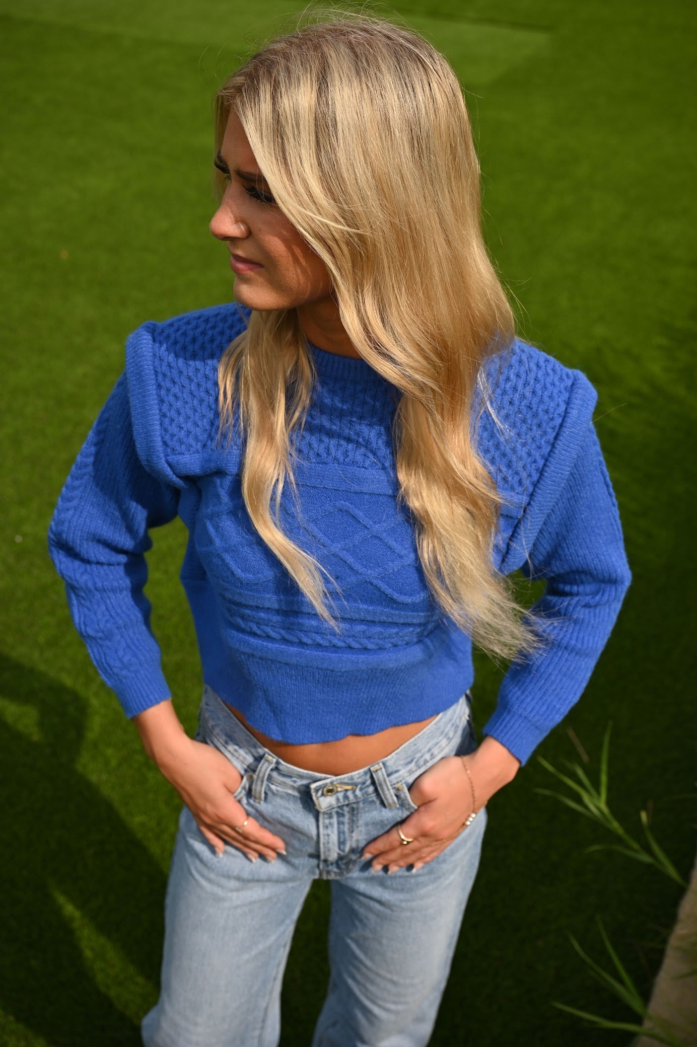 Wrap yourself in the Florence Sweater's embrace, a stunning royal blue knit that combines classic cable patterns with a modern silhouette. Its plush texture and ribbed trim offer both warmth and style, while the puff sleeves add a touch of sophistication to your winter wardrobe. Perfect for chilly days.