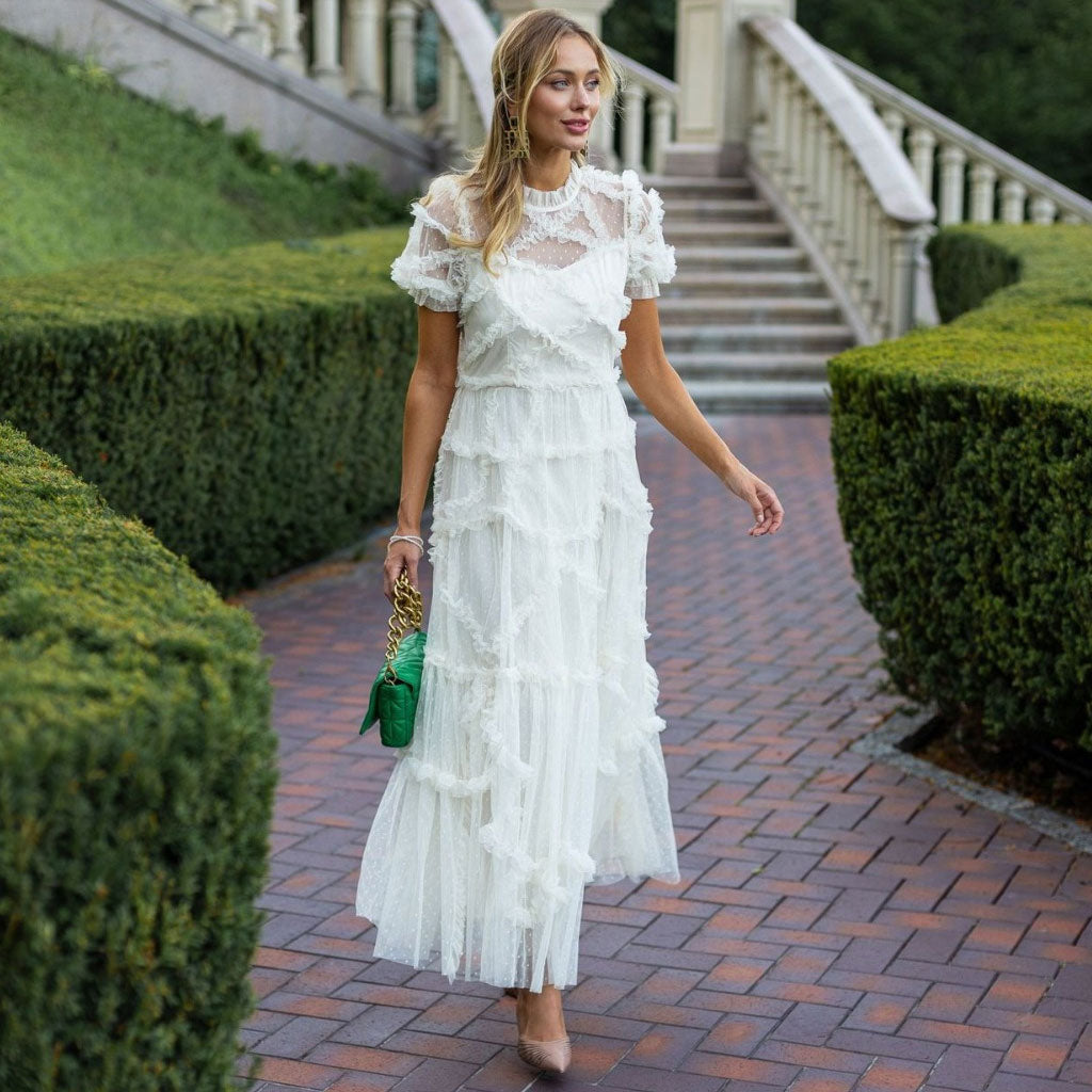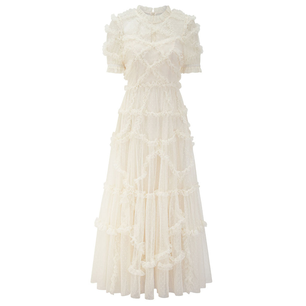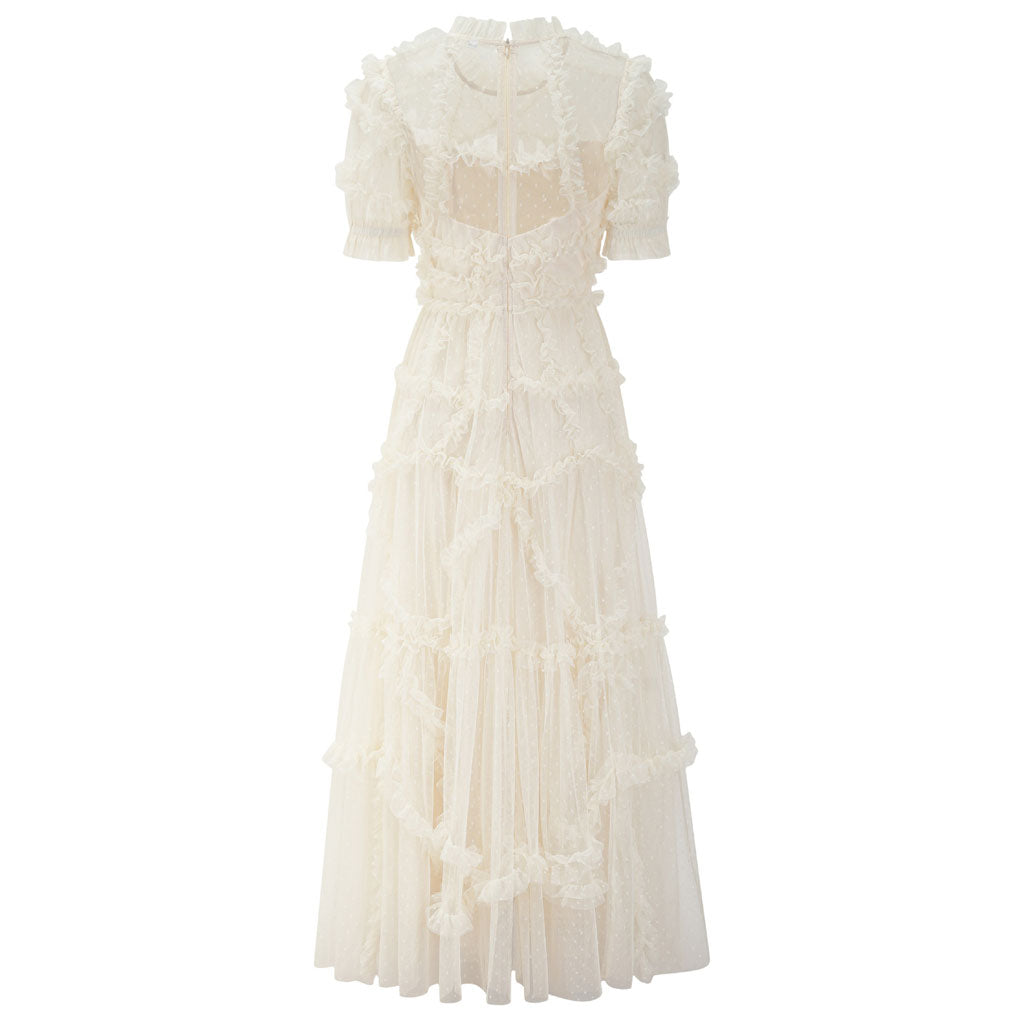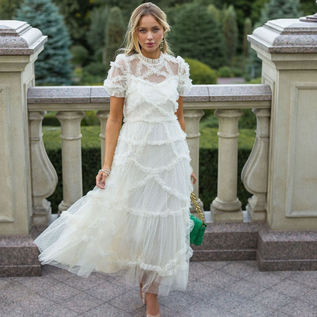French Style Frill Neck Short Sleeve A Line Dotted Ruffle Tulle Tiered Maxi Dress