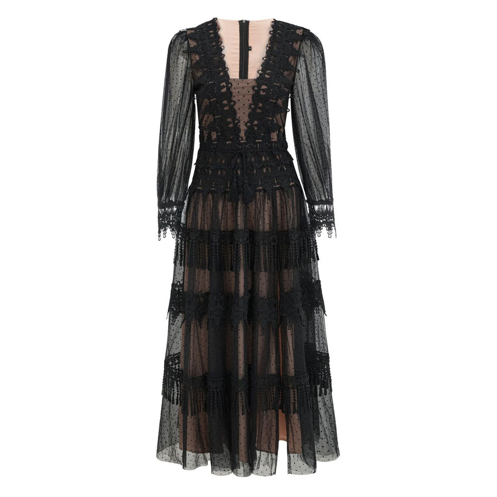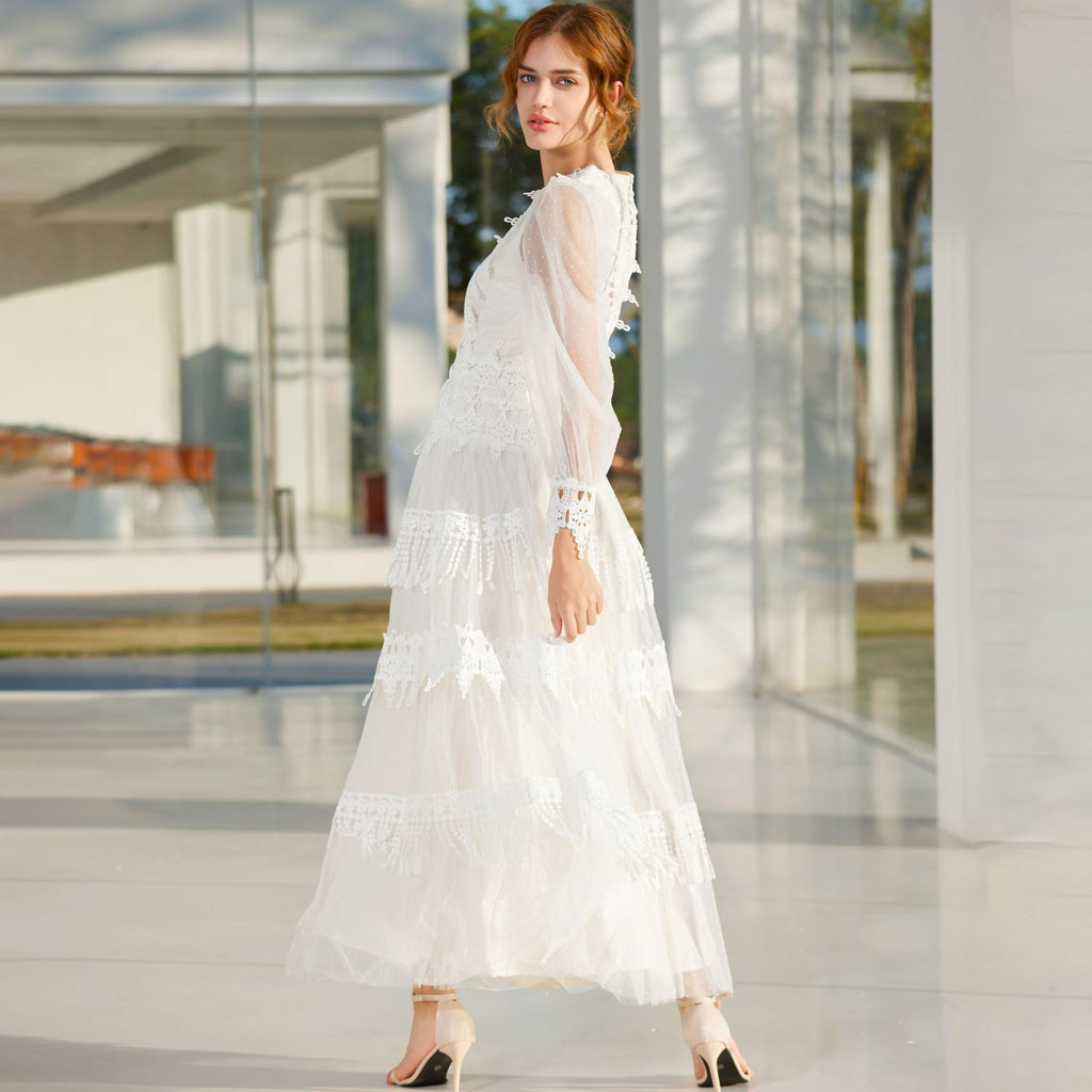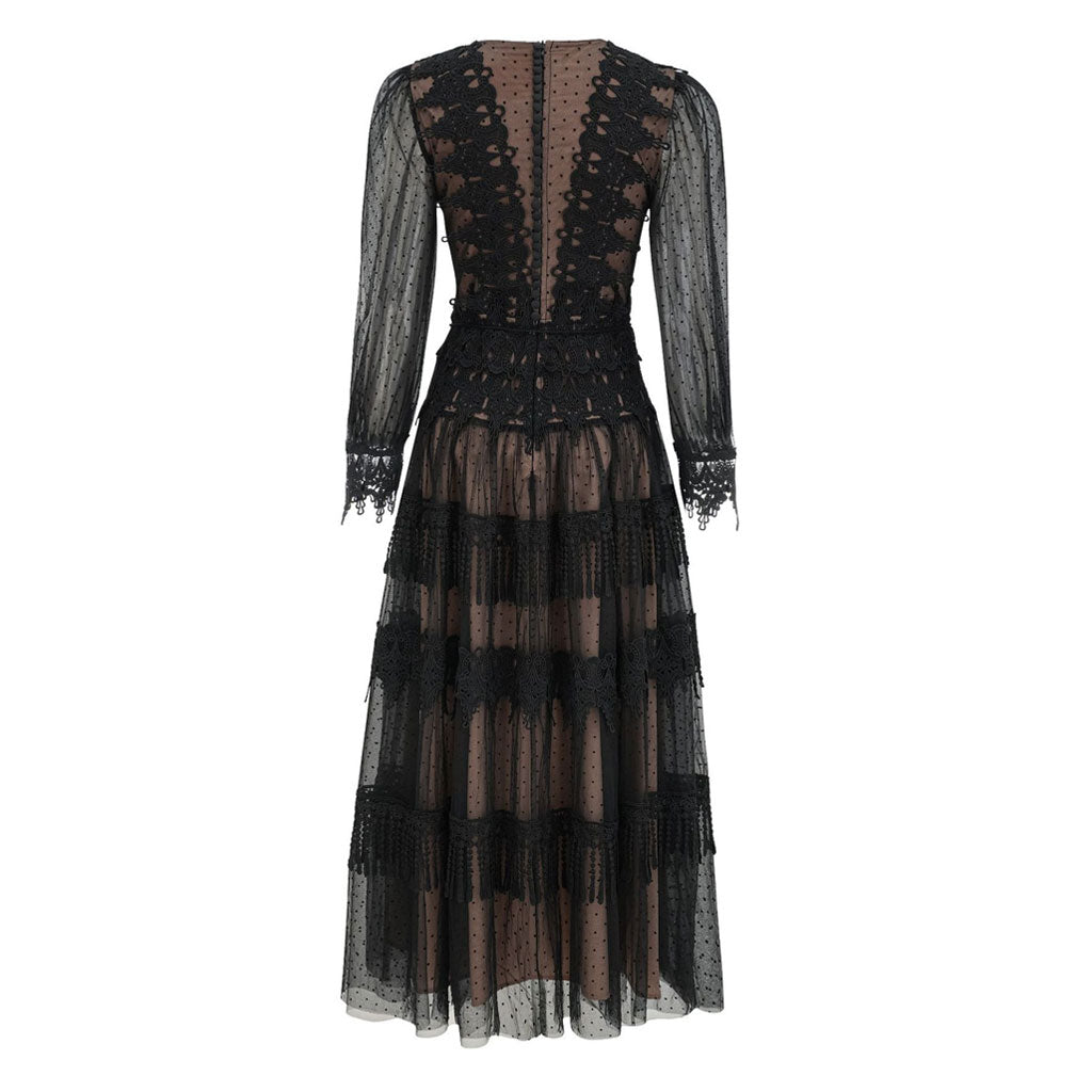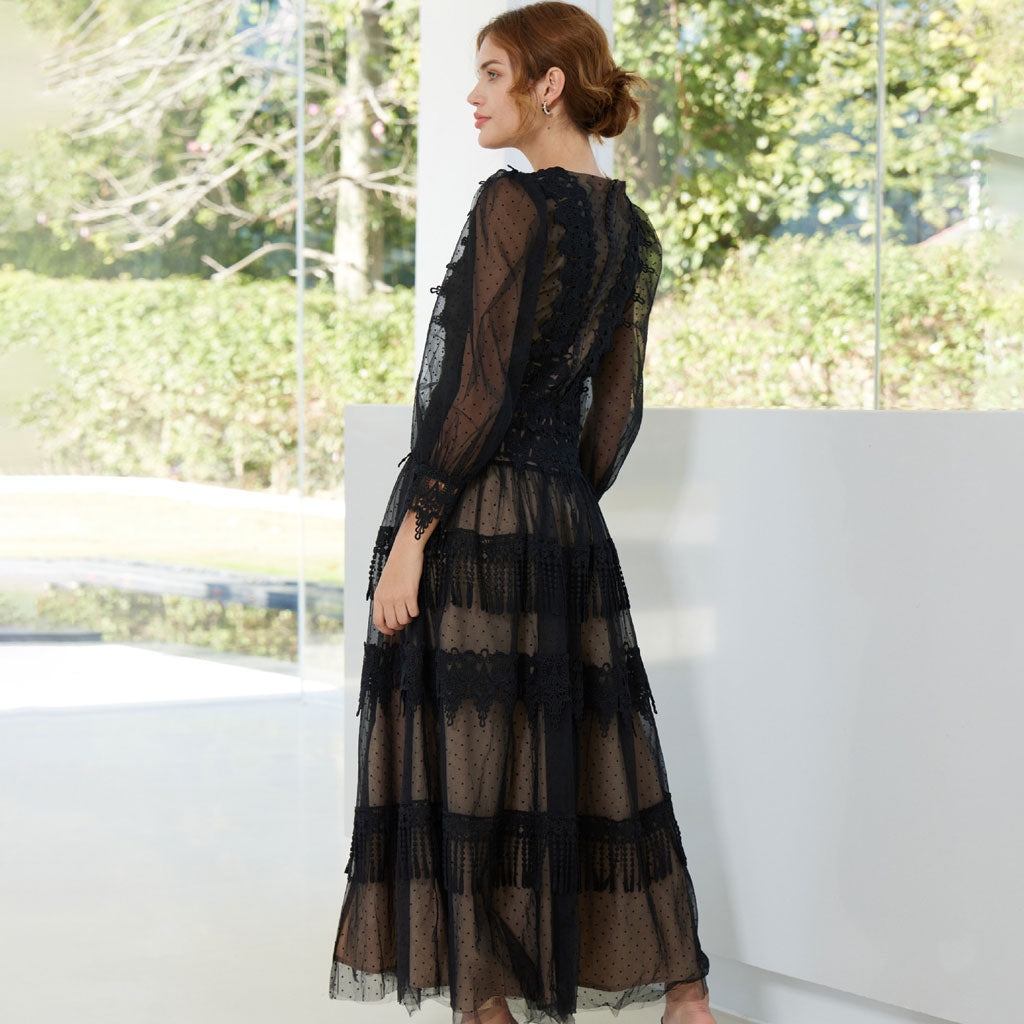 French Style Polka Dot Print Bishop Sleeve High Split Tassel Layered Lace Maxi Dress