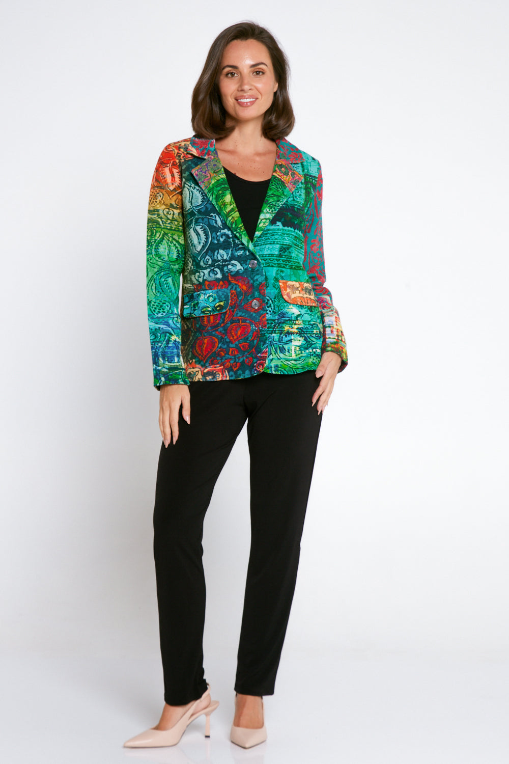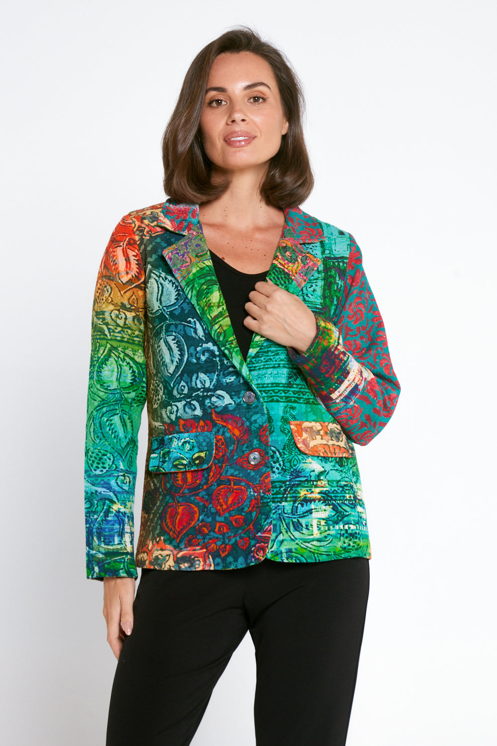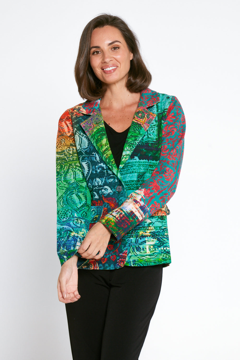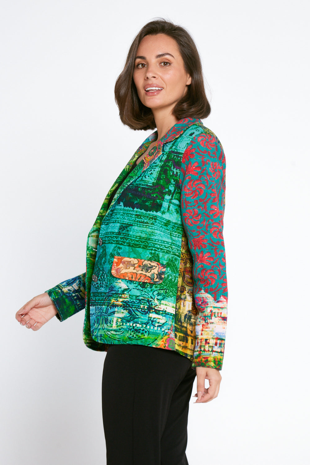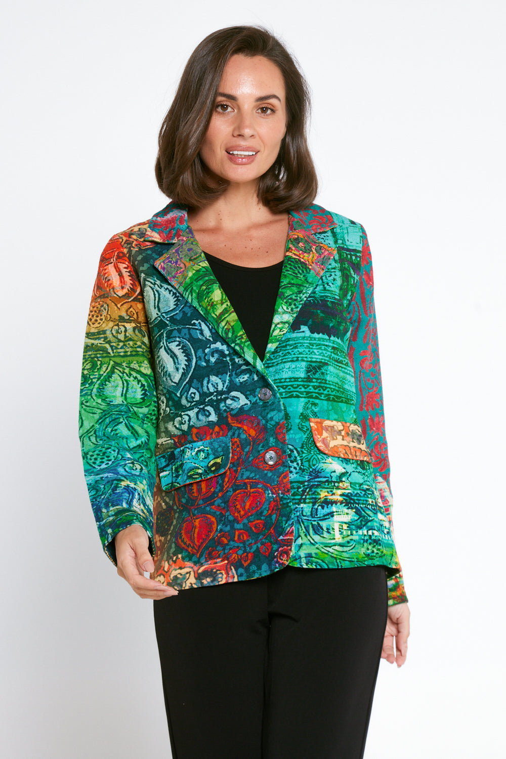 Elevate your winter wardrobe with a statement in our Digital Blazer. With its exclusive Orientique print and modern patchwork design in vivid minty greens and citrusy oranges and yellow, this coat is a work of art. Easy to dress up or down, this is the perfect piece to add style and sophistication into your daily outfits. Featuring vivid colours, intricate prints, 100% cotton, front pockets, structured shoulders, and single breasted buttoning, this is a blazer that is sure to make you stand out in a crowd.