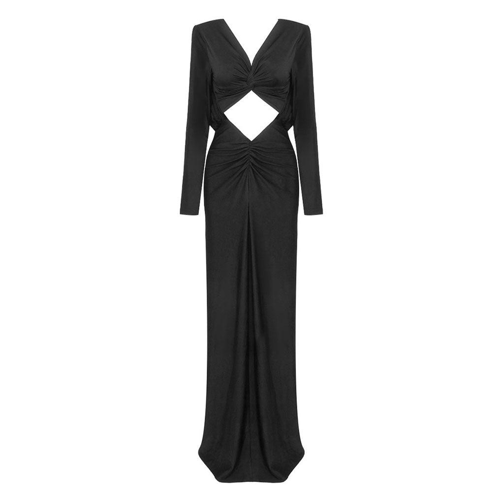 Soar to the pinnacle of grandeur with our designer black gown. designed for posh occasions. This long-length cut crafted from lightweight jersey gives a chic. sophisticated vibe. The dramatic V-neckline and jaw-dropping bodice cut-out with a twist at the bust make a bold statement. Shoulder pads provide a regal touch. while the gathered waist offers a flattering silhouette. A discreet back zipper gives the perfect fit. Revel in the luxury and refined beauty of this ravishing long-sleeved dress for autumn and winter.