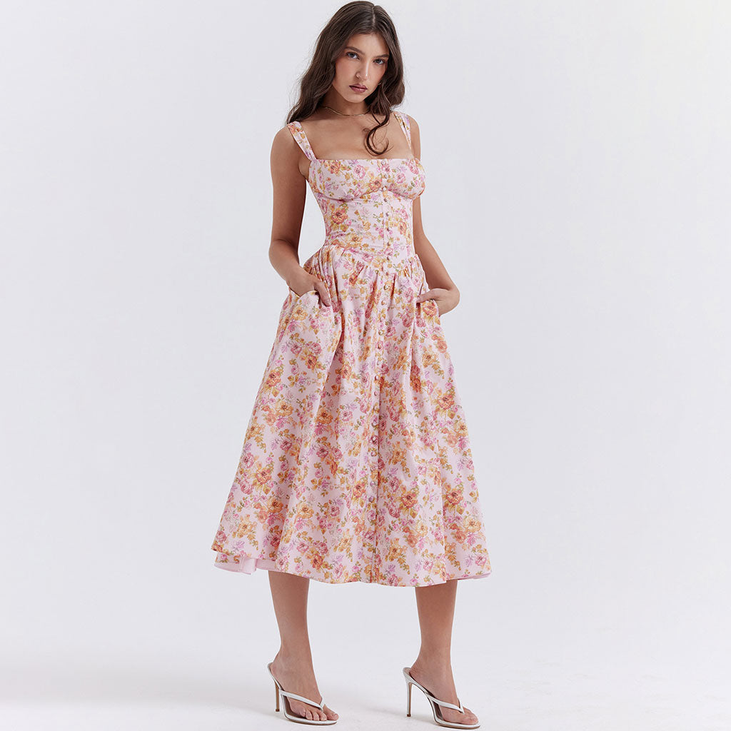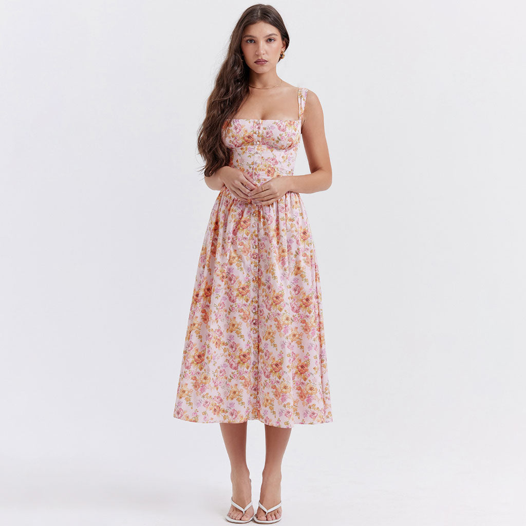 Prairie Printed Square Neck Button Detail Drop Waist Lace Up Back Midi Floral SunDress