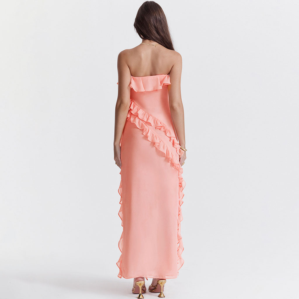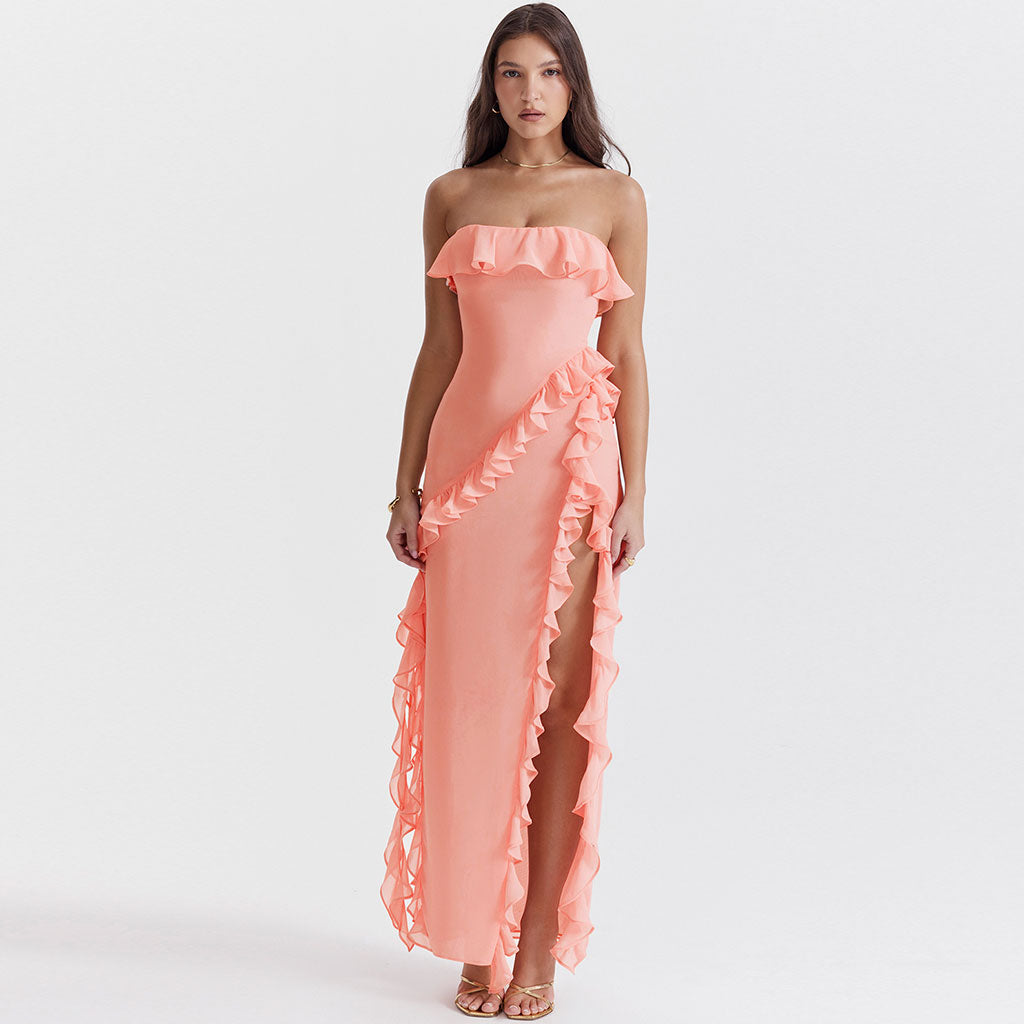 This ravishing designer ruffle dress exudes the utmost elegance and sophistication. Its alluring style is elevated by the captivating flounce detail on the straight neckline while the gracefully flowing frilled thigh-high side slit adds a daring and irresistible charm. Additionally. the fluttery strap drapes gracefully on one side. creating an enchanting and ethereal silhouette. Adorned in a mesmerizing fusion of orange and pink tones. this maxi tube dress embodies the epitome of contemporary glamour. making it a perfect choice for summer evenings. beach outings. and strolling through the city streets.