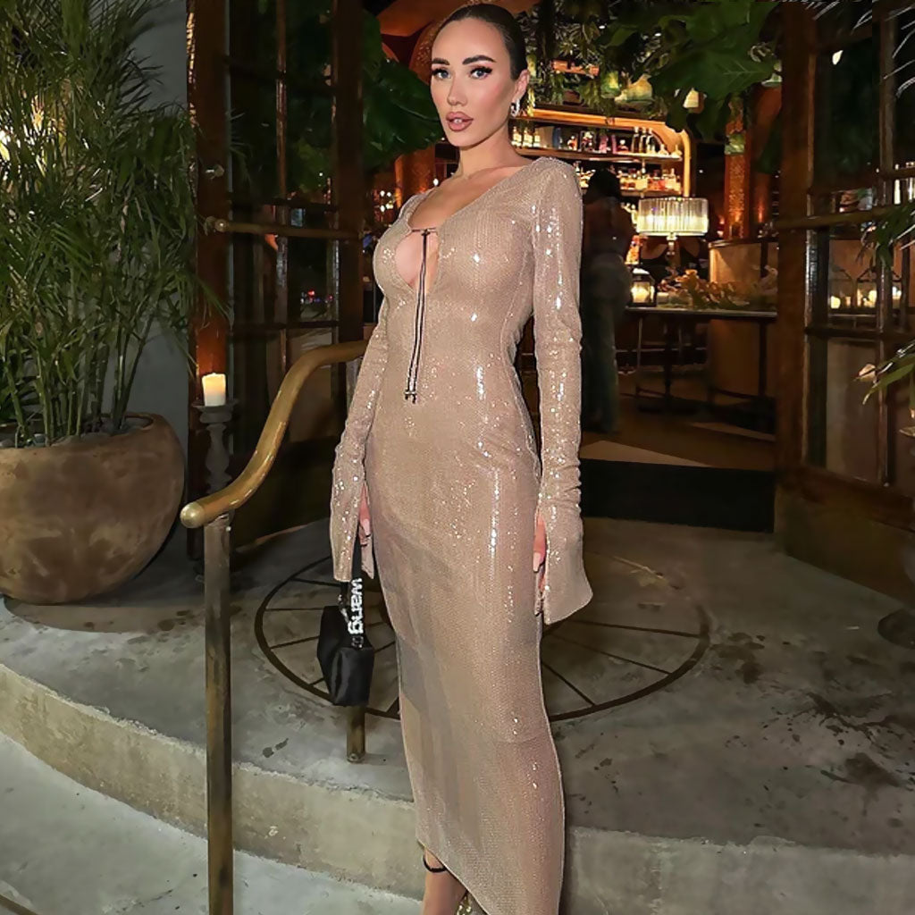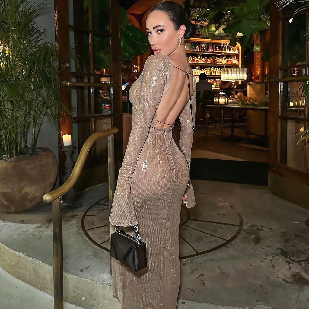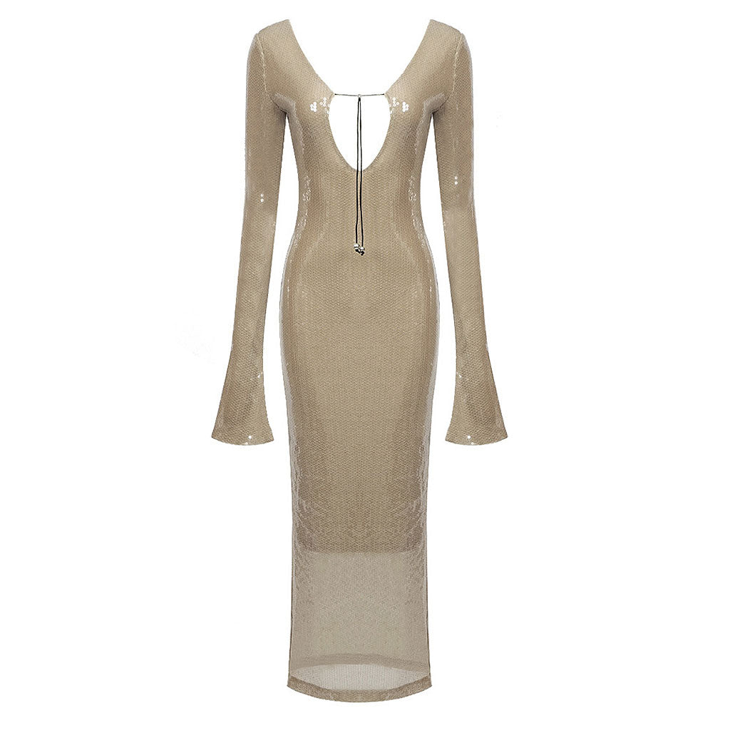 Set your style to stunning sizzle in this sparkly dress cut to a maxi length in a curve-skimming silhouette. The spectacular nude dress is spun from stretchy material. coated in sequins for a first glance. Although it may look simple. it's full of details. such as keyhole cut-out to the front. long sleeves with open cuffs and dangling drawstring closures. It also digs low to a deeply scooped back for revealing flashes of skin. Keep the rest of your outfit simple with clear heels. which will be the perfect pinch of shine for the evening.