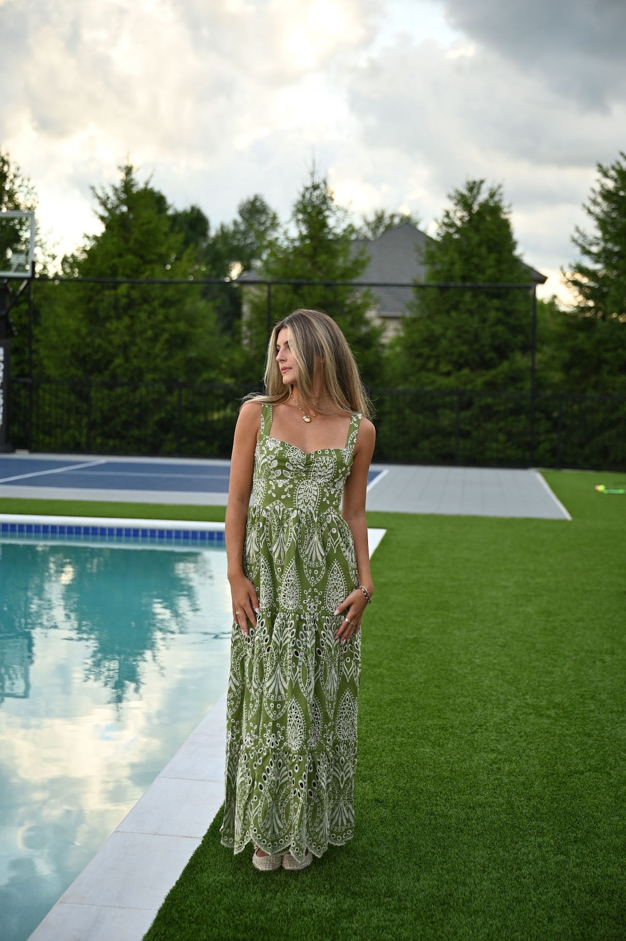 Step into boho chic with this green paisley sundress. Featuring a sweetheart neckline and adjustable straps, this dress offers a perfect fit and feminine flair. The intricate paisley pattern adds a touch of elegance, while the tiered skirt provides a breezy, relaxed silhouette. Ideal for casual outings or summer festivals.