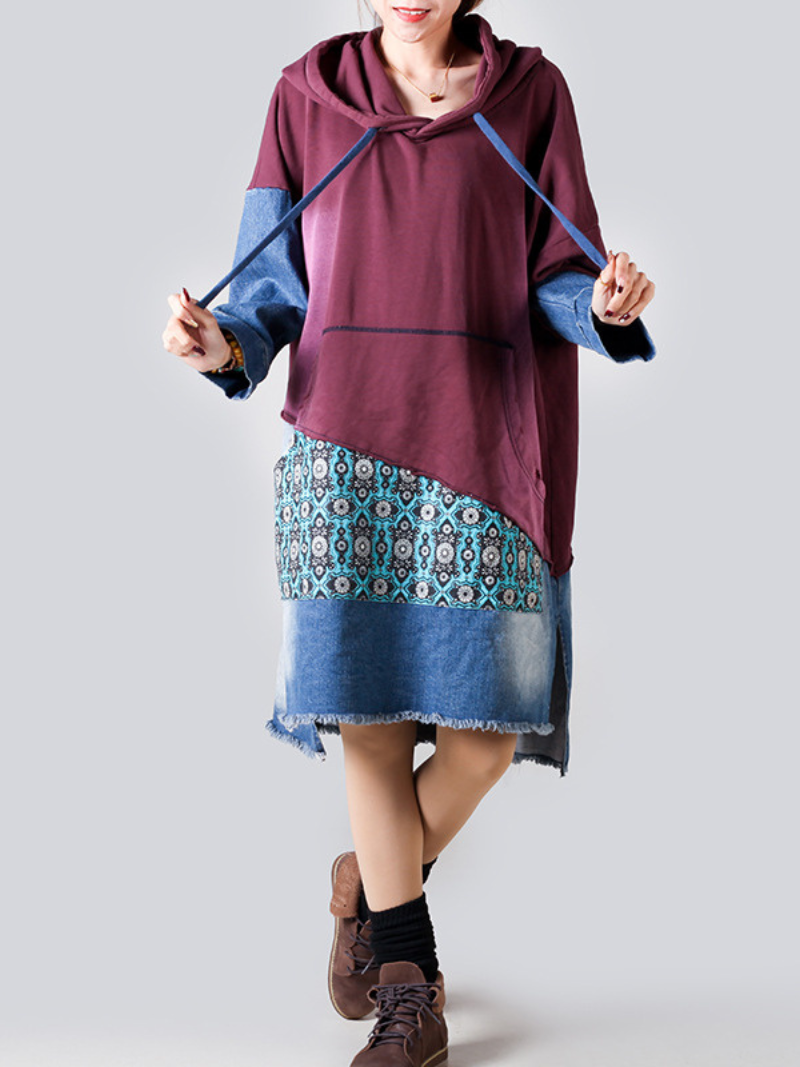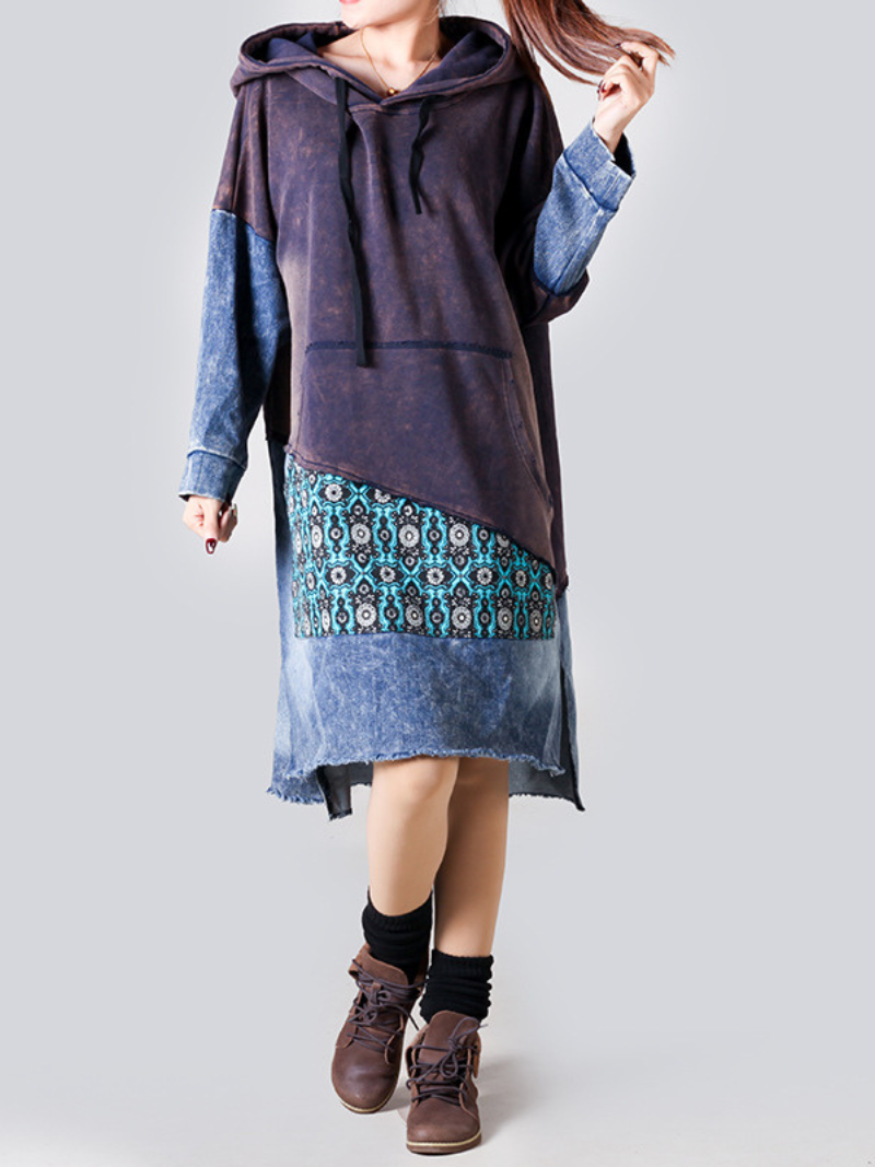 Retro Large Size Hooded Long Sleeve Pullover Denim Midi Dress