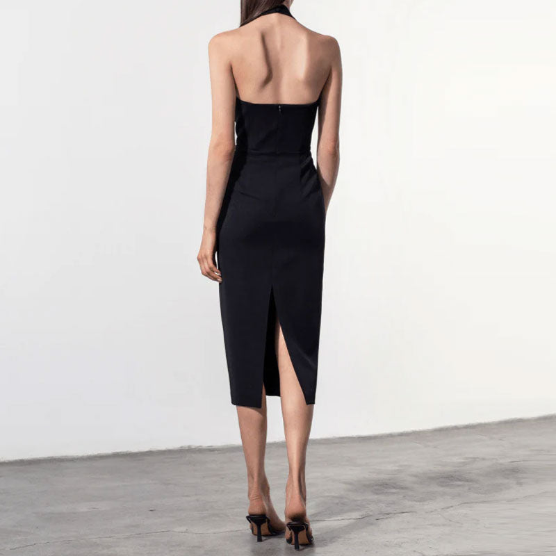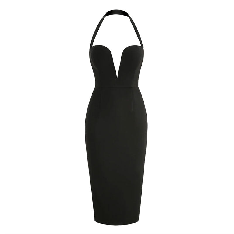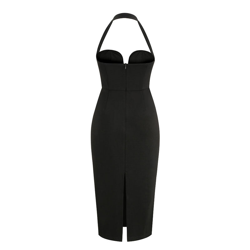 Sexy Plunging Halter Neck Back Slit Sleeveless Bodycon Midi Dress - Black