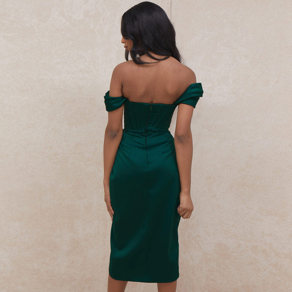 Silky Satin Off Shoulder High Slit Drape Corset Midi Dress - Emerald Green