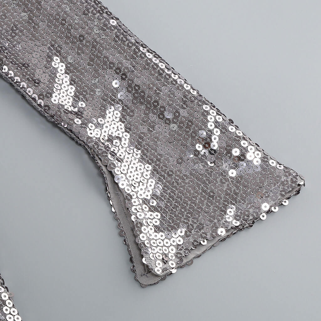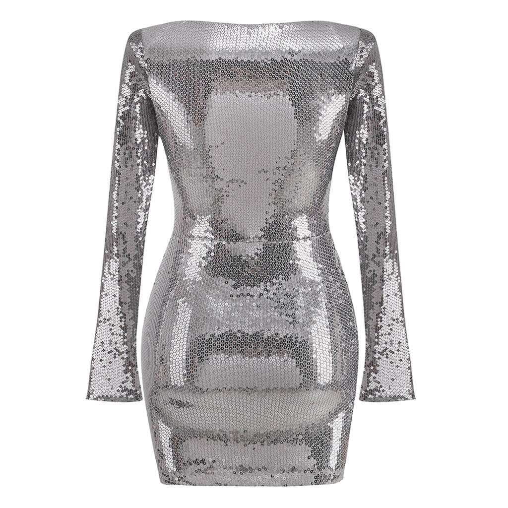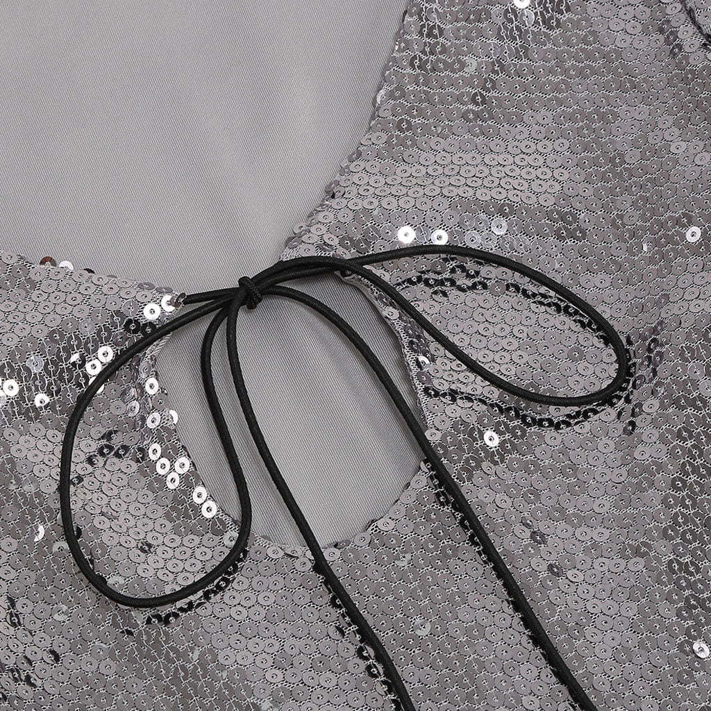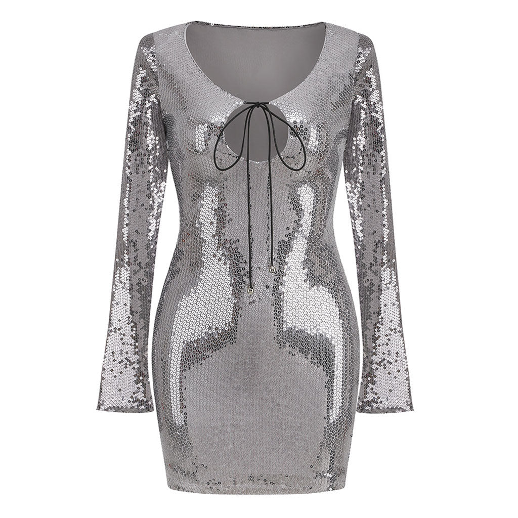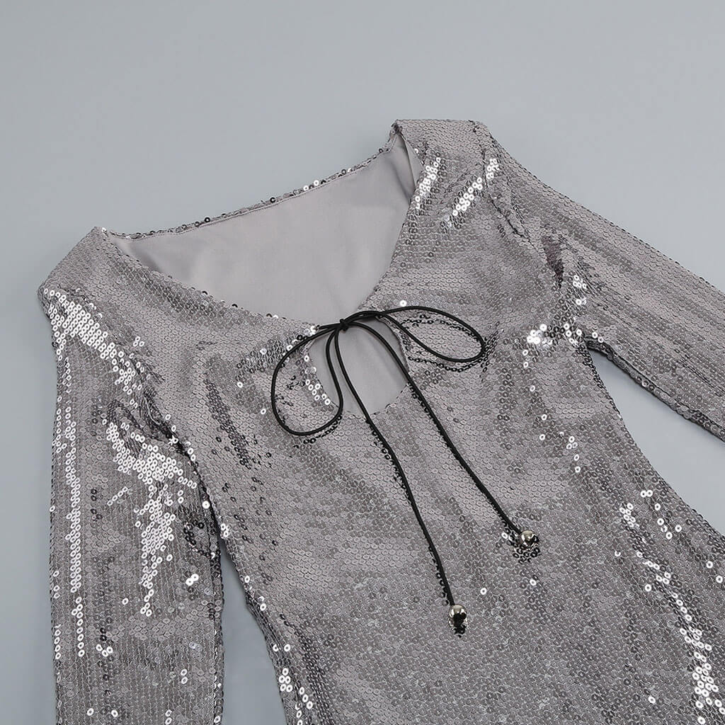 Sparkly Tie Front Keyhole Round Neck Shoulder Pad Split Long Sleeve Mini Sequin Dress