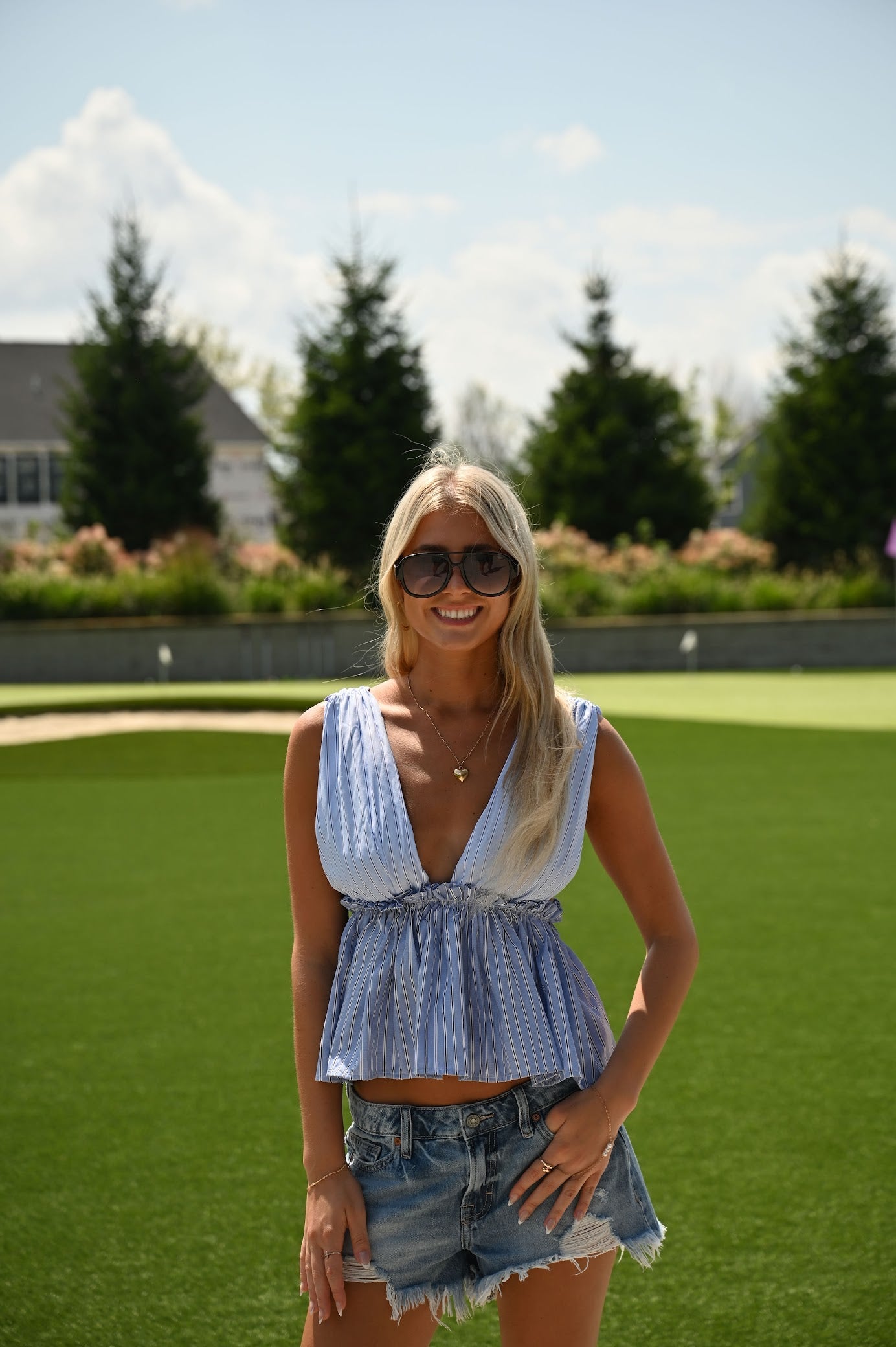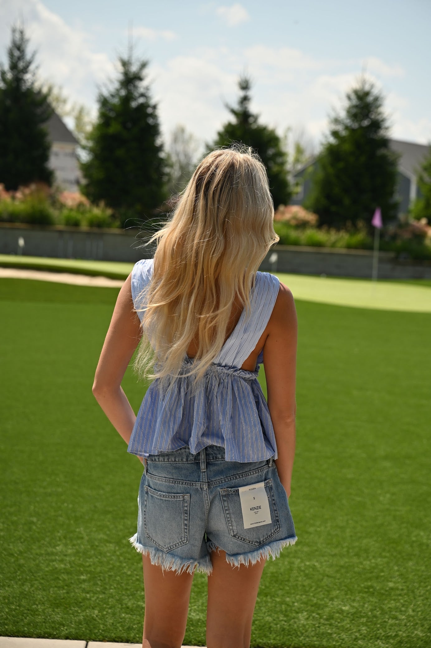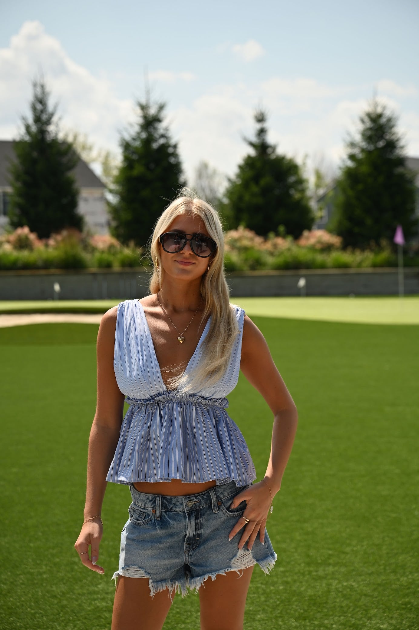 Dive into summer with our Atlantic Top in Baby Blue! This charming peplum silhouette features playful stripes that add a touch of nautical flair to your wardrobe. The fluttery peplum detail creates a flattering shape while the breezy fabric