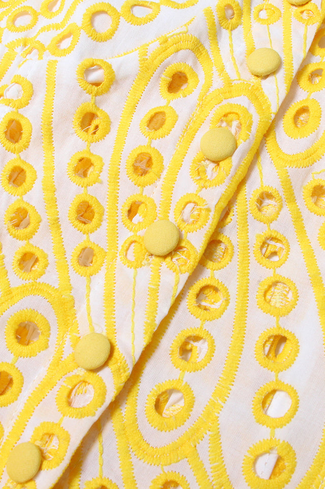 Undeniably romantic. the Irene dress. crafted in a cotton blend with partially lined broderie anglaise. features a fitted silhouette with a button down front.