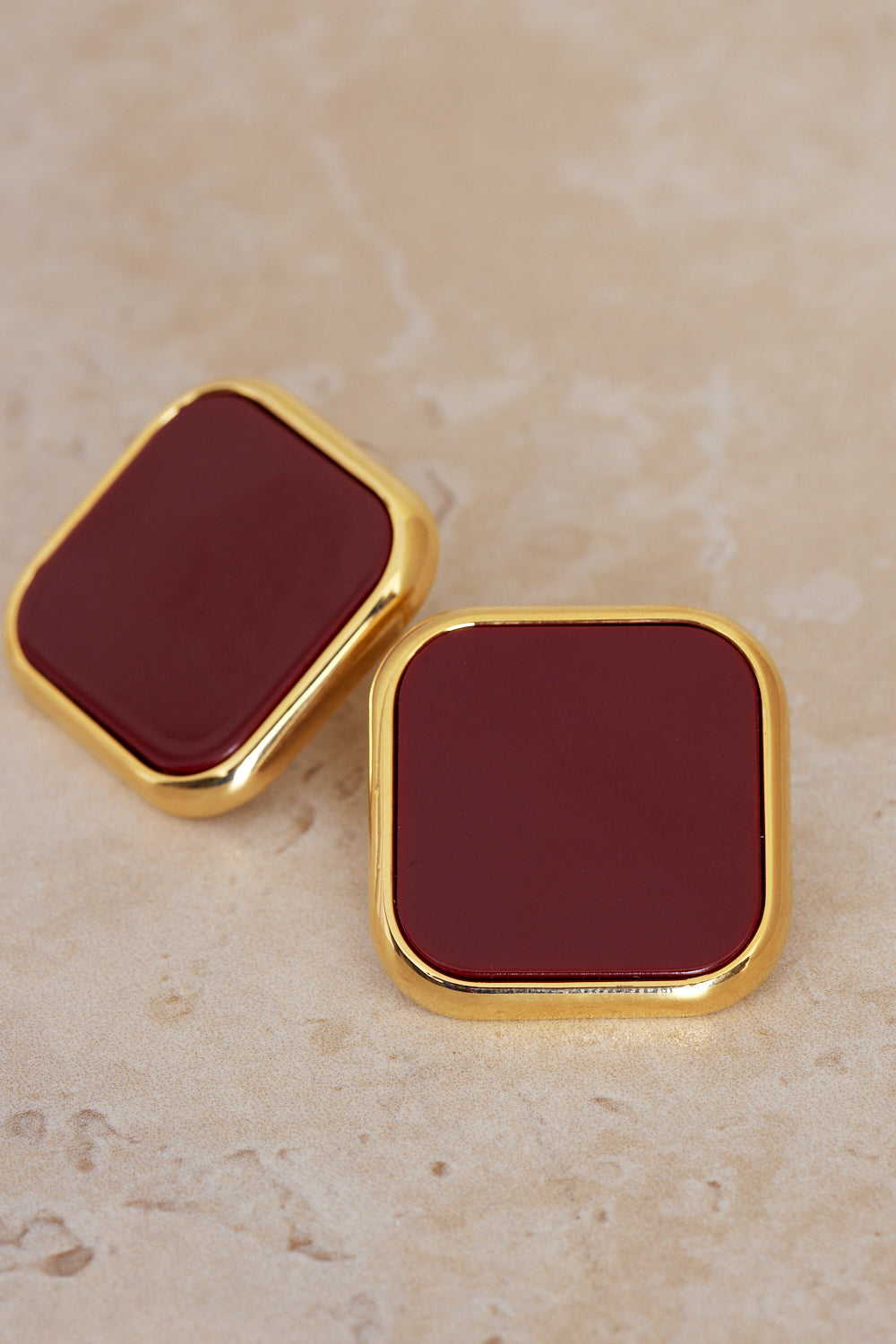 Introducing our Ruby and Gold Square Stud Earrings, a chic and modern addition to your jewellery collection. These earrings feature a bold, square design with a sleek black centre, framed by a polished gold border. The minimalist style and striking contrast make these earrings a versatile accessory for any occasion.